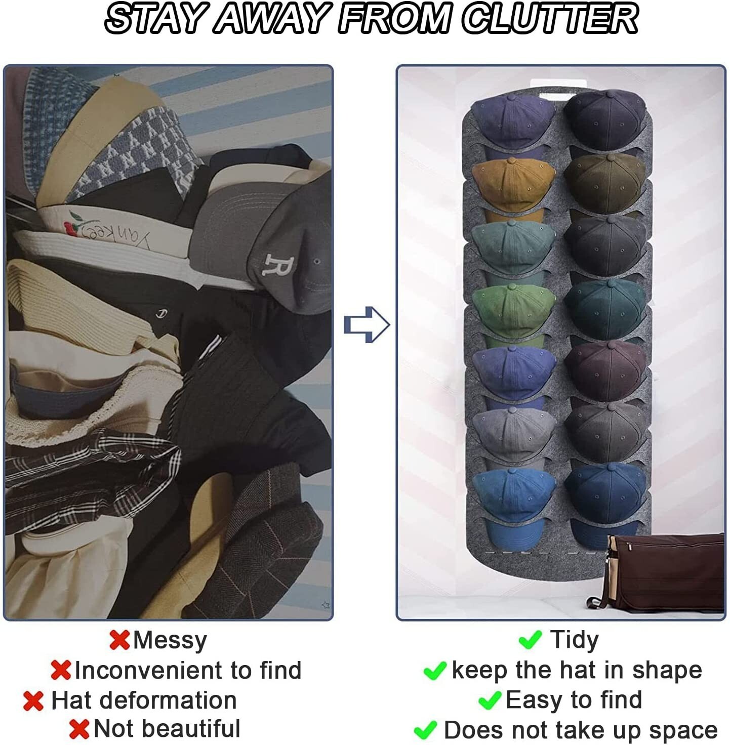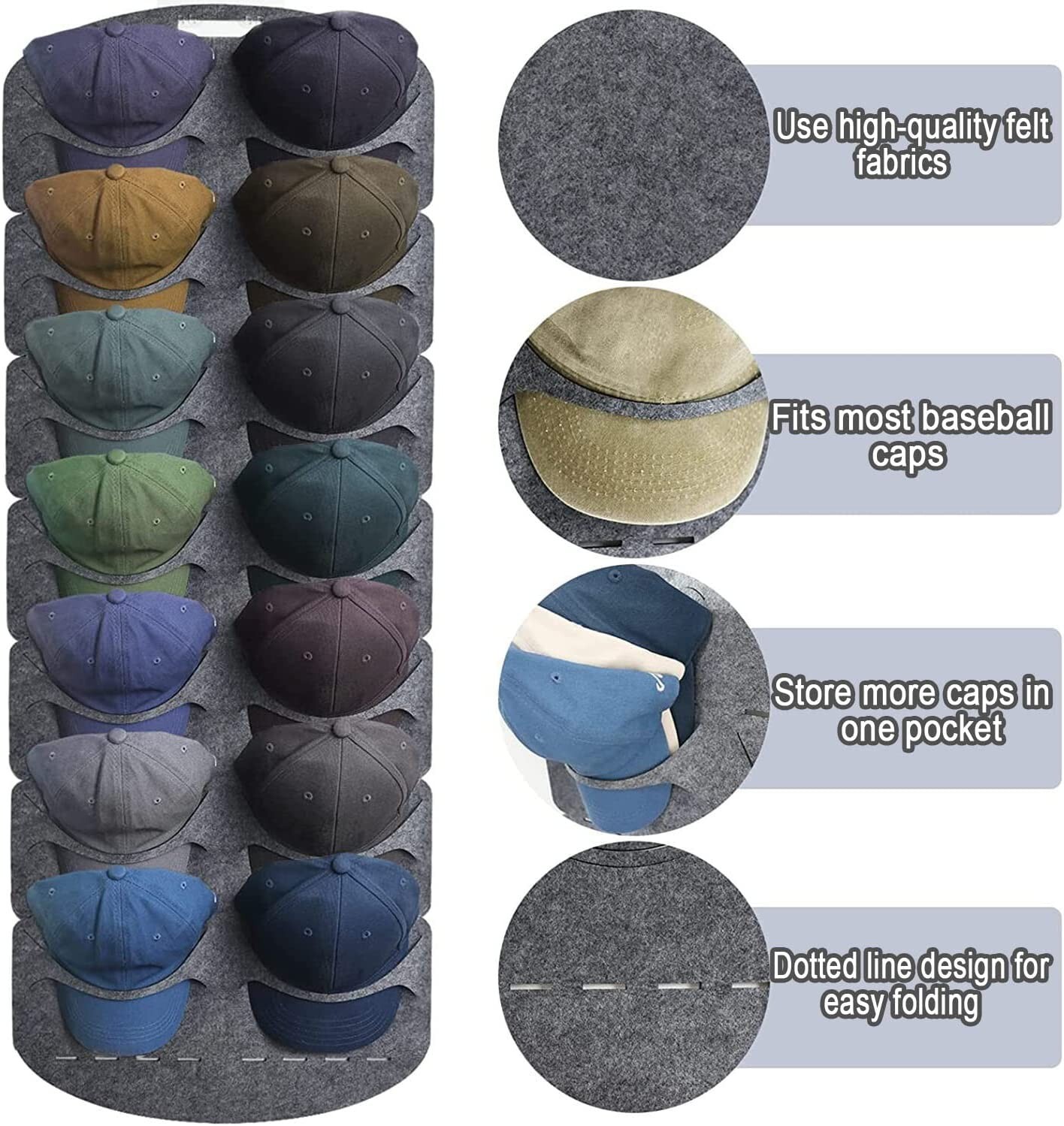 Foldable Baseball Cap Rack Organizer,14 Pockets Door Back Wall Hanging Hat Storage Bag Features and Further Details 【Traceless Hook】 Double line Neatly arranged,hat rack keeps your baseball cap away from the chaos.Hat holder organizer works great to keep your hats tidy and Our hat rack for wall design is curved to keep your hats damage-free 【Easy to Install】 Hat organizer was easy to assemble and is very convenient.No tools or DIY expertise is required, just hang up and prepare the baseball hat rack immediately! Foldable design saves space and stows it away when not in use 【Minimalist Desing】 Our hat holder is designed to showcase your hats. When your hats are hanging, our hooks are mostly hidden from view.Arrange the hooks however you'd like to create a stylish hat display 【Multi-Purpose】 Excellent hat storage solution for many types of hats including baseball caps, snapbacks, fitted hats, visors, and flat-brim hats.It also can be used for headphone hanger, sun glass, headbands, scarf and other house hold items 【Great gift】 Hat holder racks have a very stylish appearance, which can show your hat well. Compatible very well with home decoration of modern design, keep your item organized and get your room tidy and clean. It's Best gift for you Dad,Brother, Boyfriend Contact us We can be contacted at any time through eBay messages if you have any questions, comments or product requests. We will respond to you within 24 hours and do our best to help you out! We encourage our customers to contact us with any questions or concerns! We'd like to be sure you are completely satisfied with your purchase. Returns Offer 30-day money-back guarantee on all items. If you need to return an item for a refund, please contact us within the return period.Any product you return must be in the same condition you received it and in the original packaging. Please keep the receipt. Shipping All orders ship within 1-3 business day. Standard shipping is FREE on all items . Please keep in mind, if placed over the weekend your order will ship out the following business day. When your order ships, you will be emailed tracking information. International shipping is handled by eBay's Global Shipping program. For more information please contact eBay directly. Feedback We strive for 5 stars feedback. Please take a moment to leave us positive feedback. We will work hard to please our customers so please give us a chance to solve any problems before leaving a neutral or negative feedback.. We guarantee that we will resolve any problem immediately. Please give us the opportunity to help you. Please visit our eBay store to check out other items for sale! Thank you for shopping at our store.
