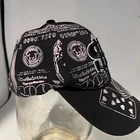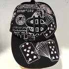 PARQUET L-FLEX Baseball Cap. OS. Black with Black Dollar Sign and silver Gambling items, playing cards, dice and chips. 65% polyester. 35% cotton