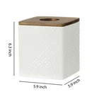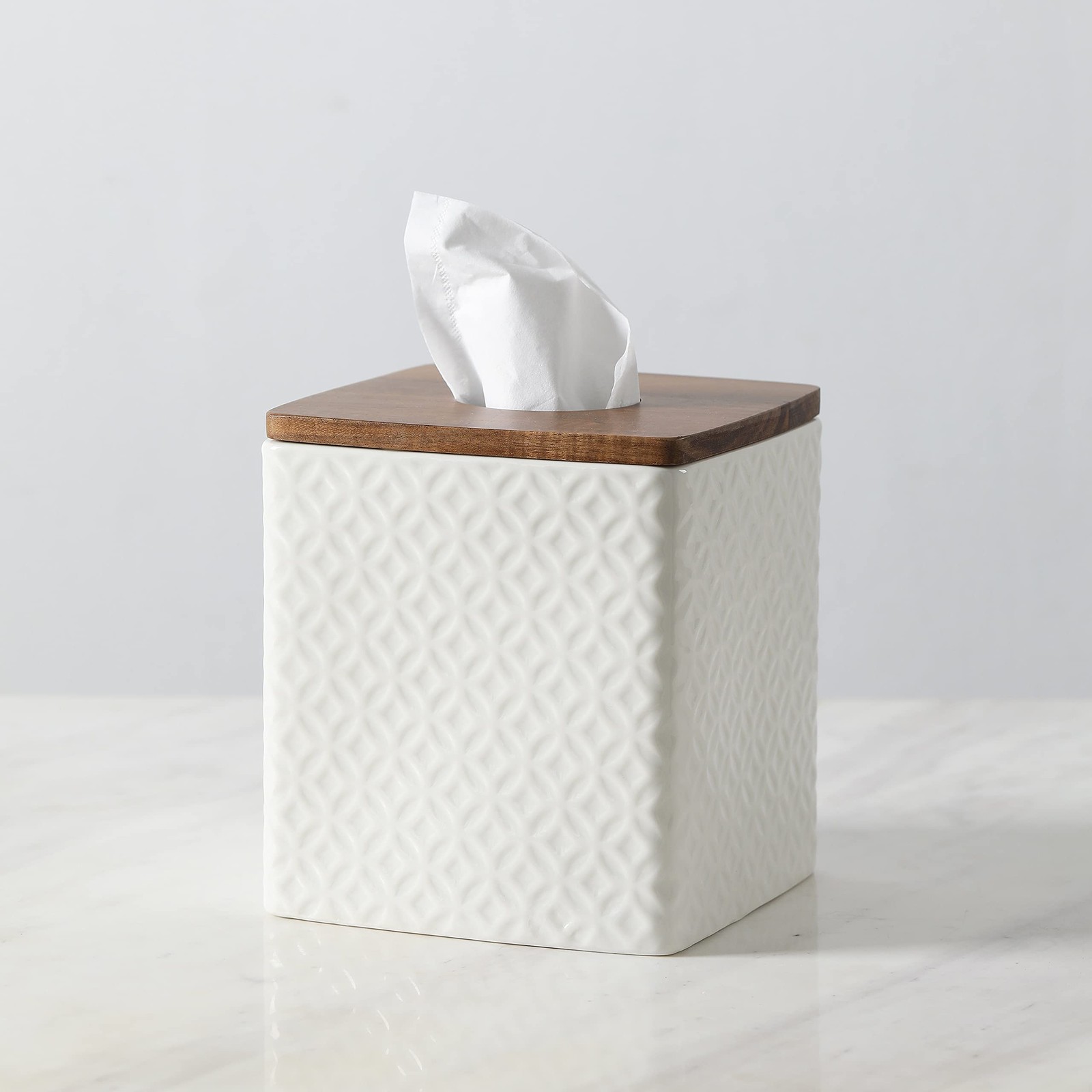 Designed for Style, Function and Efficiency 【Stylish Home Decor】Decorative paper holder and napkin dispenser with featured glossy finish with white embossed body with pattern and wooden lid makes a luxurious and classic home décor. Rounded finish offers a smooth and delightful feel to the touch. 【Efficient & Functional】Easy refill and of empty tissue boxes with the open bottom. Perfect weight for effortless pull of tissue papers and firm standing. 【Awesome Gift Idea】Tasteful choice for your friends, family, lover, partner or parents. Gorgeous housewarming, wedding, or holiday gift. 【Built to Last】Gorgeous piece made from high-quality ceramics. Sturdy and durable for everyday use. Extremely enduring for quick and easy cleaning. Rust and mold free. Water-proof and scratch-proof. 【Thoughtfully Sized】Cube tissue box holder fits most standard square tissue boxes. Fit in well in your bathroom, kitchen, bedroom, craft room, on countertop, dresser, bedside table, nightstand, toilet tank. Dimension: 5.9” Length x 5.9” width x 6.3” height.