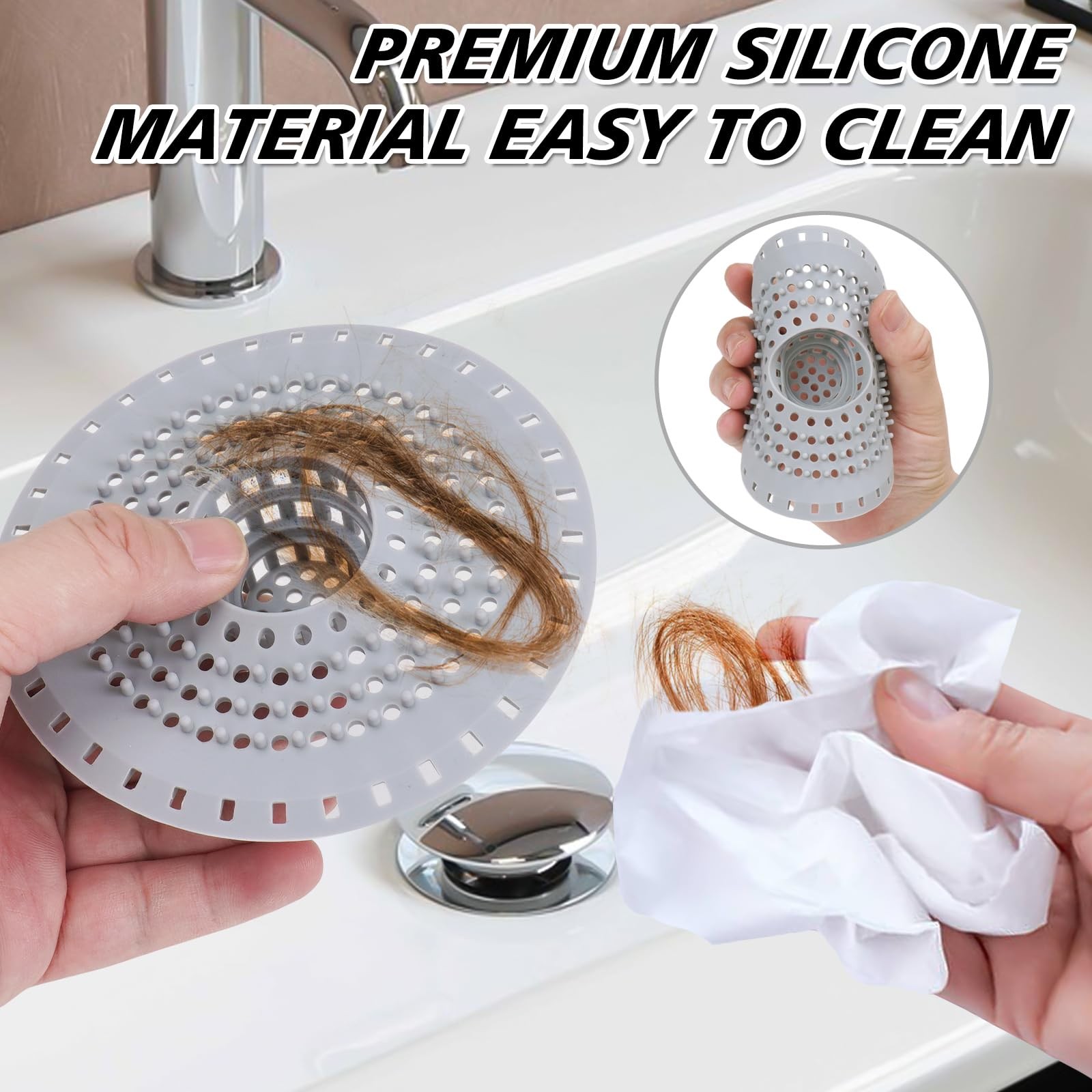 Dual Filtration – Effectively filters hair with a multi-grid design for smooth drainage. Features both column filtration and grid filtration to efficiently block bathroom hair and kitchen sink debris. Thickened Silicone Design – Soft and flexible for a better fit, waterproof, resistant to aging, and reusable. Non-Slip Design – Stays in place even with running water. The anti-slip suction adheres to the bathroom floor for a secure fit, preventing movement. Versatile Usage – Suitable for bathtubs, bathrooms, sinks, and kitchen sinks. Upgraded Efficient Hair & Debris Capture – Improved design effectively traps hair and debris while allowing water to drain through surrounding small holes, reducing clogs and minimizing the need for drain-cleaning chemicals. Dual Filtration – Effectively filters hair with a multi-grid design for smooth drainage. Features both column filtration and grid filtration to efficiently block bathroom hair and kitchen sink debris. Thickened Silicone Design – Soft and flexible for a better fit, waterproof, resistant to aging, and reusable. Non-Slip Design – Stays in place even with running water. The anti-slip suction adheres to the bathroom floor for a secure fit, preventing movement. Versatile Usage – Suitable for bathtubs, bathrooms, sinks, and kitchen sinks. Upgraded Efficient Hair & Debris Capture – Improved design effectively traps hair and debris while allowing water to drain through surrounding small holes, reducing clogs and minimizing the need for drain-cleaning chemicals.
