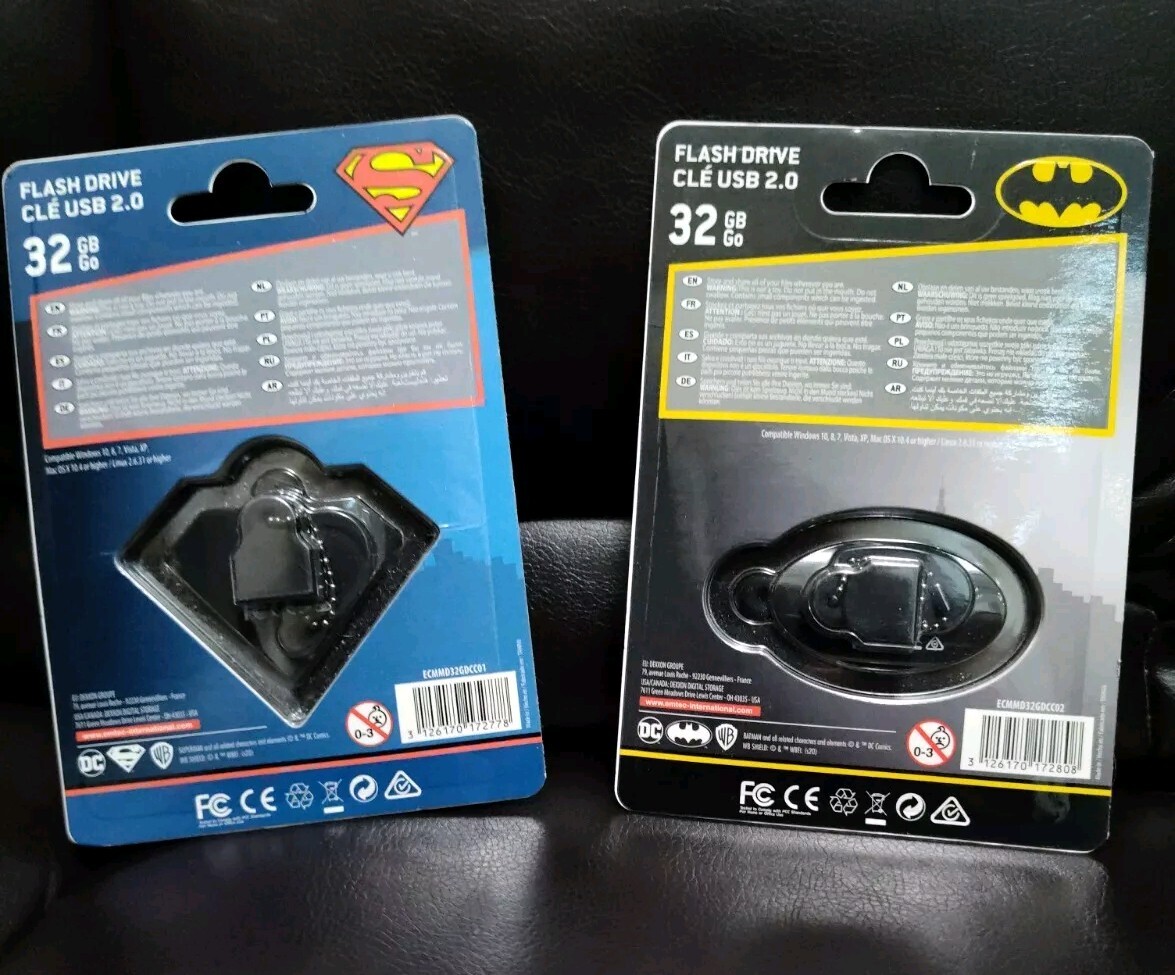 This USB flash drive set features two iconic superheroes, Batman and Superman, with each one having a storage capacity of 32 GB. The flash drives come with keychains and are perfect for fans of DC Comics. The colorful design and USB interface make it easy to use and transport. Ideal for those who need to store and share large files, this flash drive set is a must-have for any superhero fan.