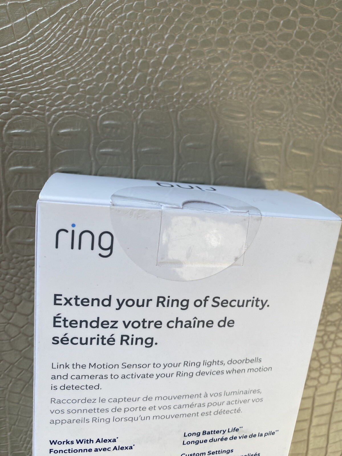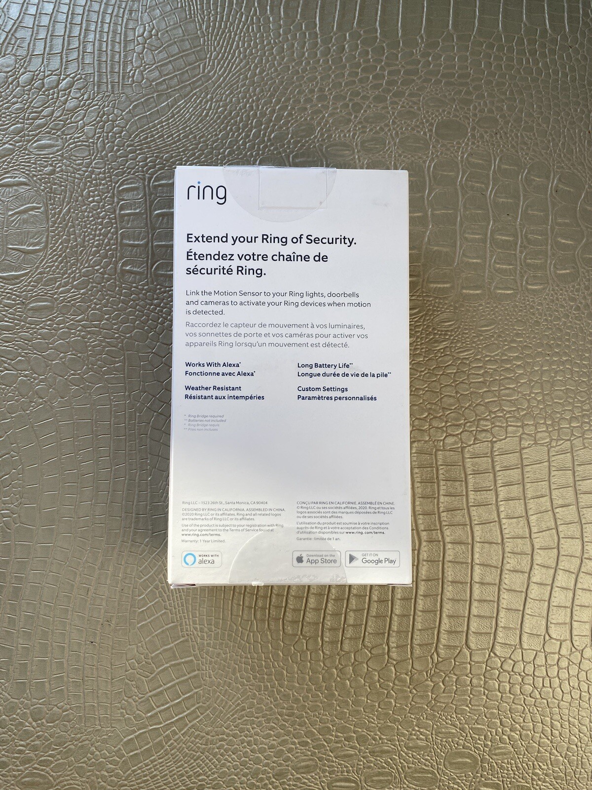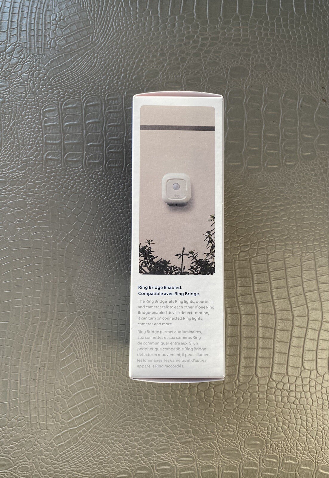 Brand new item in original package never opened The Ring Smart Lighting motion sensor Colour white Batteries not included You need to have a ring bridge to use this device. I will not accept return for this device unless the box comes back to me new and sealed