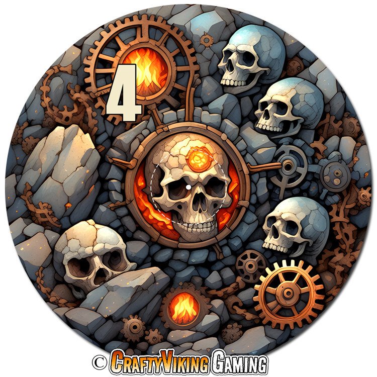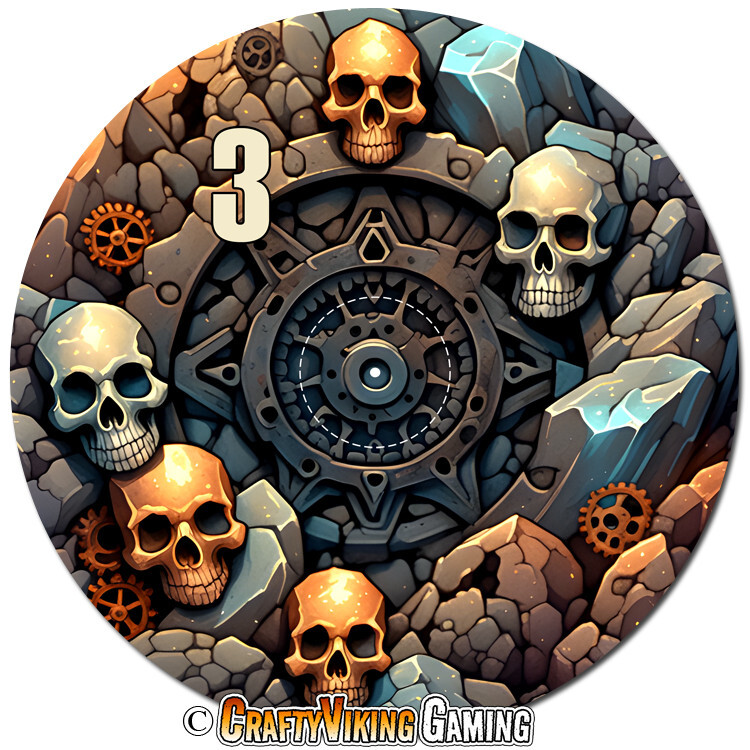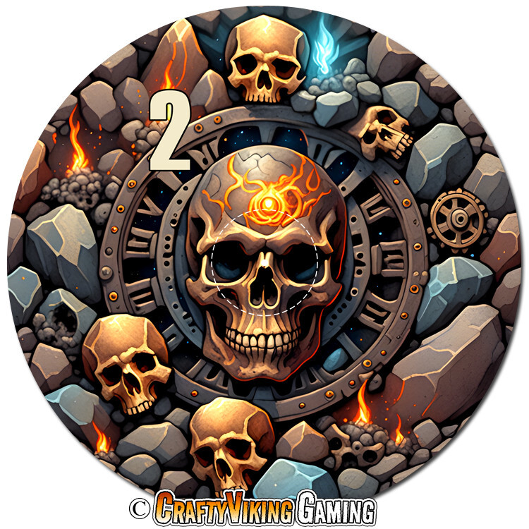Battlefield Set of 6 objective markers for Warhammer 40K and Age of Sigmar 4th Edition . This set features a concrete and rubble filled battlefield with skulls, gears & twisted metal. Numbered 1-6 40 mm (marked center circle) for simple measuring plus 3 inches to the edge Total diameter 192 mm or 7.57 inches 2 mm thin neoprene (mouse-pad) material Non-slip rubber backing Enhance your gaming experience with these high quality attractive objective markers. No more guessing if a model is in range. Thanks for shopping & happy gaming!