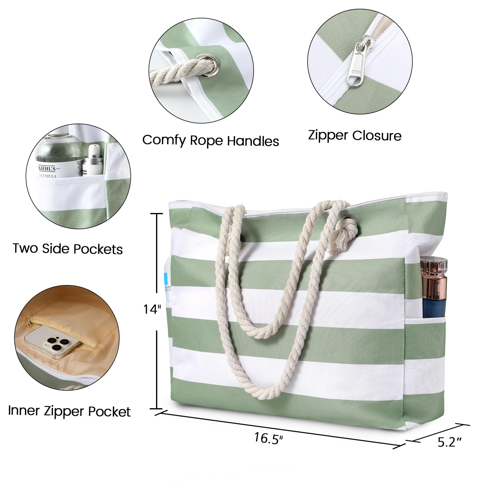 Beach Bag for Women - Large Beach Tote Bag, Waterproof Sandproof Beach Bag with Zipper, Large Swim Pool Beach Tote, Green LARGE SIZE / CAPACITY - Size: 16.5"L x 14"H x 5.2"W. This beach tote bag is large enough to hold clothing, beach towels, sunglasses, cosmetics, books, cellphone, purses, keys, food, etc. However, this tote bag is lightweight & foldable, and easy to carry. HIGH QUALITY OUTDOOR FABRIC - Apply a WATERPROOF and SANDPROOF material, our beach bag can protect your items from getting wet or dirty. With super robust and EASY-TO-CLEAN fabric, our beach bag will is your ideal travel companion. PROFESSIONAL DESIGN - This beach bag features 1 outside top SBS zipper closure+ 2 side pockets + 1 inner pocket + Comfy Rope Handles + 2-layer Fabric. With our beach bag you can your belongings while you play without fear that they will get wet because our beach tote provides them with protection. STYLISH BEACH BAG - This beach bag is designed especially for women, simple and leisure, elegant and fashionable. Different Colors and Diversified Patterns Beach Bags give you more choices. MULTIPLE OCCASIONS - This beach tote for women brings nature, uniqueness and chic. It effortlessly doubles as a beach vacation bag, swim pool bag, nursing bag, weekend bag, gym bag, grocery bag, everyday bag, etc. An ideal choice for women.