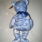 This Beanie Babies plush toy is a must-have for collectors and fans alike. With its festive design, this holiday teddy bear is sure to bring joy to anyone's day. Made by the trusted brand Beanie Babies, this plush is made to last and is recommended for children ages 3 and up. The toy is part of the Beanie Babies character family and is perfect for fans of the brand. Its age level includes children aged 3-4 years, 12-16 years, and 17 years & up. This Beanie Babies plush is categorized under Toys & Hobbies and Beanbag Plush, making it a great addition to any collection. LIGHT BLUE WITH WHITE SNOWFLAKES AND NAVY BLUE SCARF WITH WHITE SNOWFLAKES