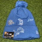 The product is a Detroit Lions adult winter knit hat by New Era, designed for fans of NFL player Jared Goff and the Detroit Lions team. The cap is in blue color, with a one size fits all feature making it suitable for both men and women. This beanie is part of the sideline collection, perfect for showing team spirit during the football season, especially for fans gearing up for the Super Bowl.