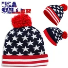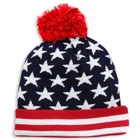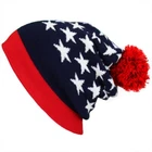 This beanie hat features a striped pattern in blue, with an American flag design including stars. It is made of lightweight, stretchy polyester knit fabric, suitable for winter wear. The hat is one size fits all and has a pom on top. Ideal for travel, parties, work, or casual outings, it exudes a patriotic and colorful theme with a touch of hipster and outdoor style.