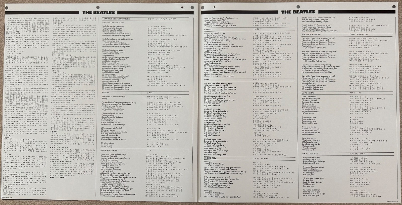 Photo and lyric insert from Please Please Me Japanese Import EAS 80550. Has a small hole in upper left corner, sourced from a new but "cutout" album. Mint condition otherwise.