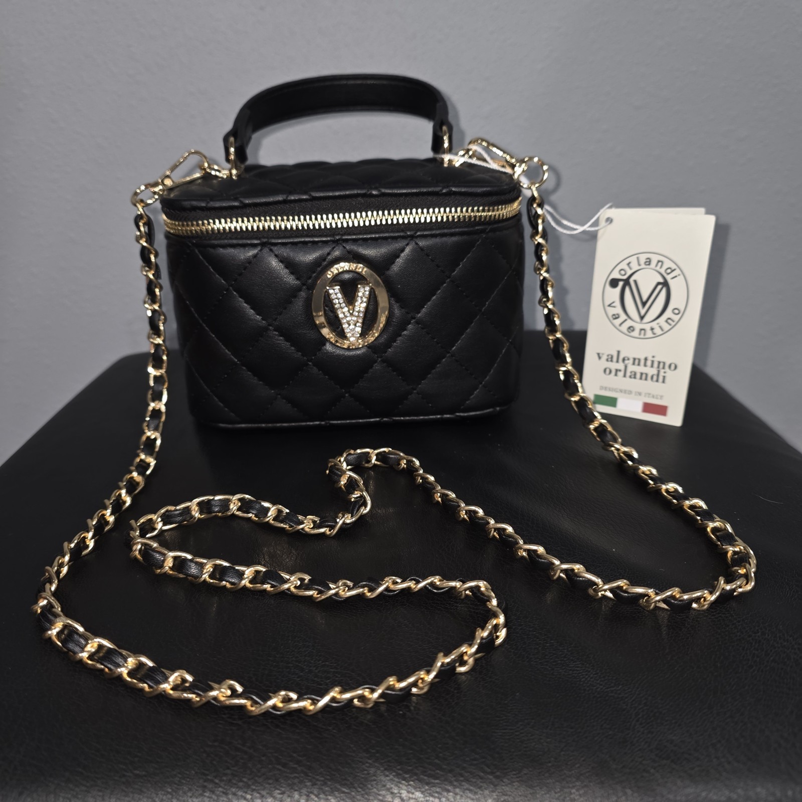 She's a beauty to add to any purse collection! 😍 The Valentino Orlandi Black Quilted Vanity-style Crossbody Bag is a stylish and versatile accessory for women. Made from faux leather with a quilted finish, this small rectangular bag features a black exterior and gold hardware accents. It is perfect for various occasions including travel, weddings, parties, casual outings, formal events, workwear, and business meetings. The bag also includes a chain strap for added convenience and a touch of luxury. Made in Italy, this crossbody bag from the Valentino VLogo collection exudes sophistication and elegance.