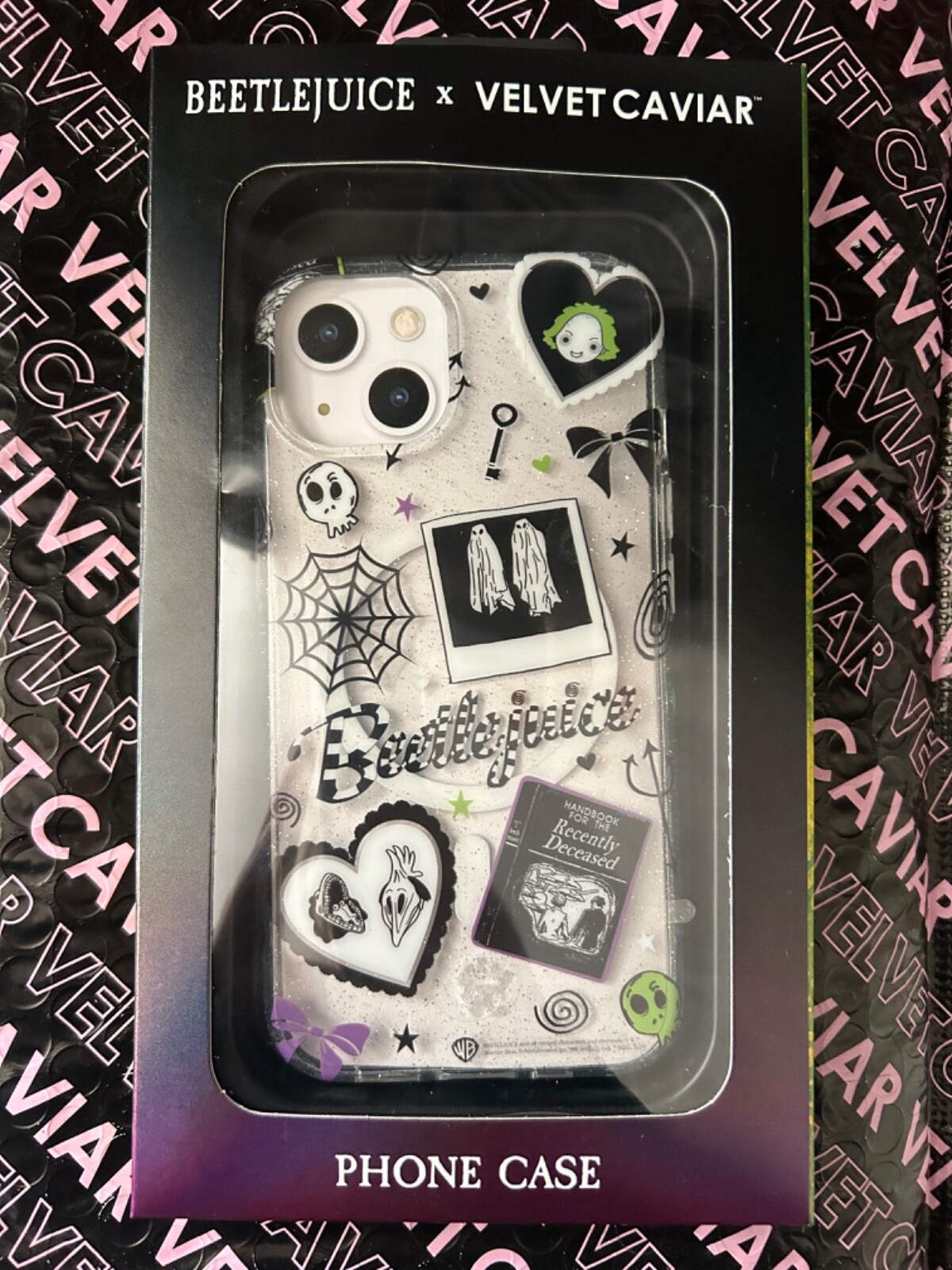 The phone case is designed for the iPhone 13 model and features a Beetlejuice-themed design. It is made by the brand Velvet Caviar and is specifically compatible with Apple products. The case offers protection and style for your iPhone 13, showcasing a unique Beetlejuice design that adds a touch of personality to your device.