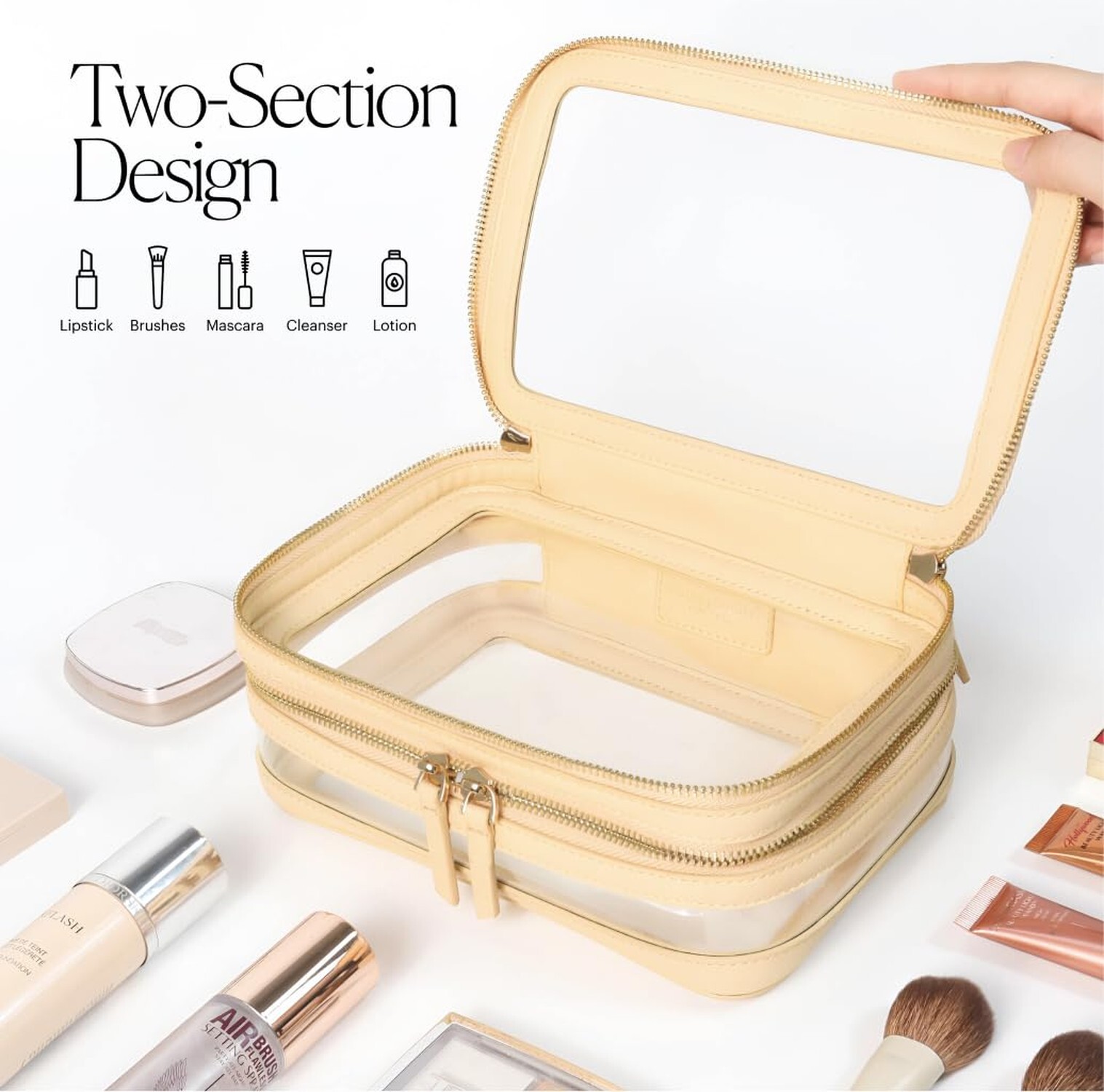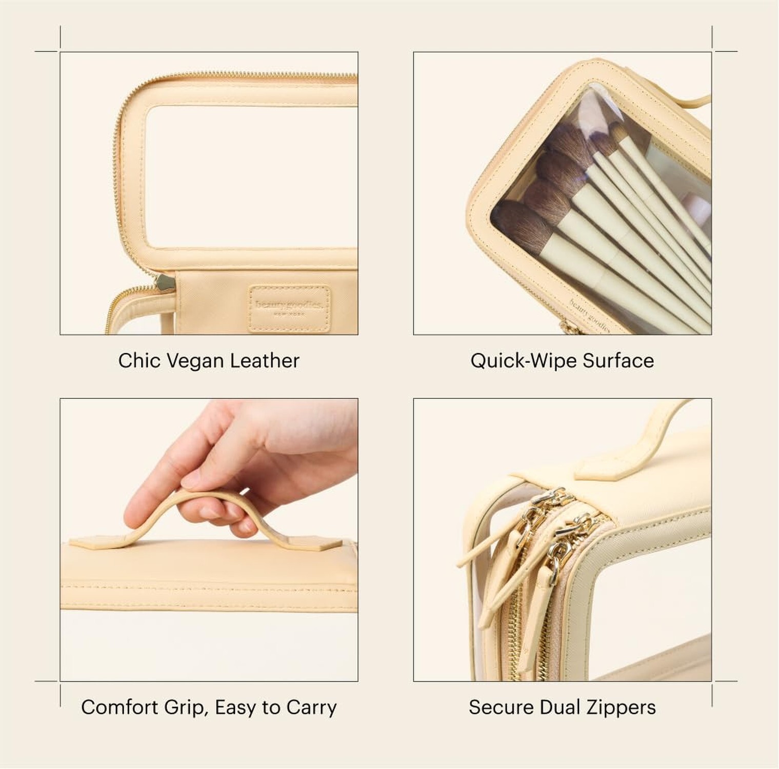 Large Clear Makeup Bag for Women with Zipper Organizer, Beige Travel Makeup Bag for Women Clear Cosmetic Case, Clear Travel Bags for Toiletries, Clear Make Up Bag Traveling Women, Car Bag Organizer Product Details Color: Beige Size: Large Brand: BEAUTYGOODIES MPN: Cosmetic bag beige UPC: Does not apply EAN: Does not apply Product Dimensions: 9 x 7 x 4 inches Item Weight: 1.2 pounds Department: Womens car makeup bag Manufacturer: BEAUTYGOODIES Country of Origin: USA Item model number: Cosmetic bag beige UNDERSTATED ELEGANCE IN BEIGE: Our beige makeup bag clear, made from Saffiano vegan leather and clear vinyl, secures and organizes your essentials with a structured design that maintains its shape for sophisticated, convenient travel SMOOTH FUNCTIONALITY WITH DUAL ZIPPERS: Glide through your beauty routine with the ultra-smooth dual zippers of our clear cosmetic bag, designed for durability and ease. Access your items quickly and without hassle, enhancing your travel experience with every use TSA COMPLIANT AND TRAVEL-READY: This travel-friendly clear makeup bags for women features an ergonomic handle and a waterproof, easy-to-clean interior, perfect for handling spills and leaks. TSA-compliant it ensures you can take it anywhere, keeping your beauty essentials within easy reach SMART, ORGANIZED STORAGE: Maximize your organizational efficiency with the clear travel toiletry bag for women's dual-sided compartments. Ideal for storing a variety of beauty products, this beige bag serves as a stylish organizer for cosmetics, skincare items, and toiletries, ensuring everything is neatly stored and accessible IDEAL GIFT FOR ANY OCCASION: The beige clear cosmetic bags for women blends practicality with style, making it an excellent gift choice for birthdays, holidays, or any special occasion. Its chic design and versatile functionality make it a beloved accessory for anyone who values elegance and organization