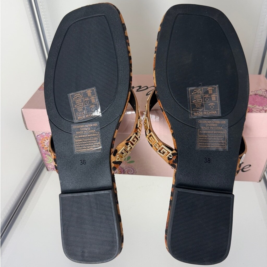 Bellanie Leopard Print Womens Flip Flop Flat Sandals Brown/Gold Size 6 New In Box Flat Sandals Flip Flops Hardware Detail Square Toe Flat Heel