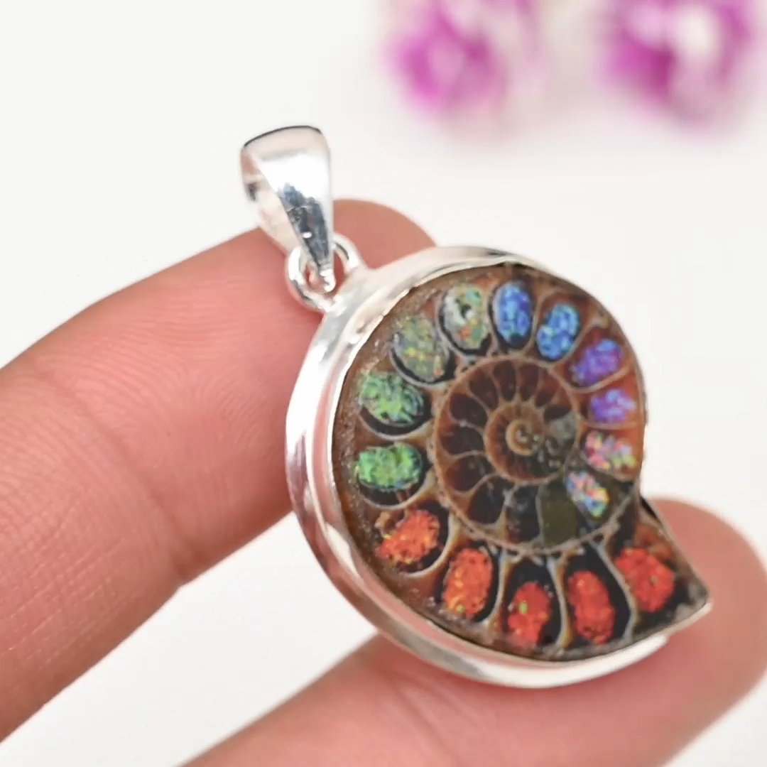 HomeBello Opal Inlay Ammonite Gemstone 925 Sterling Silver Designer Pendant Gift