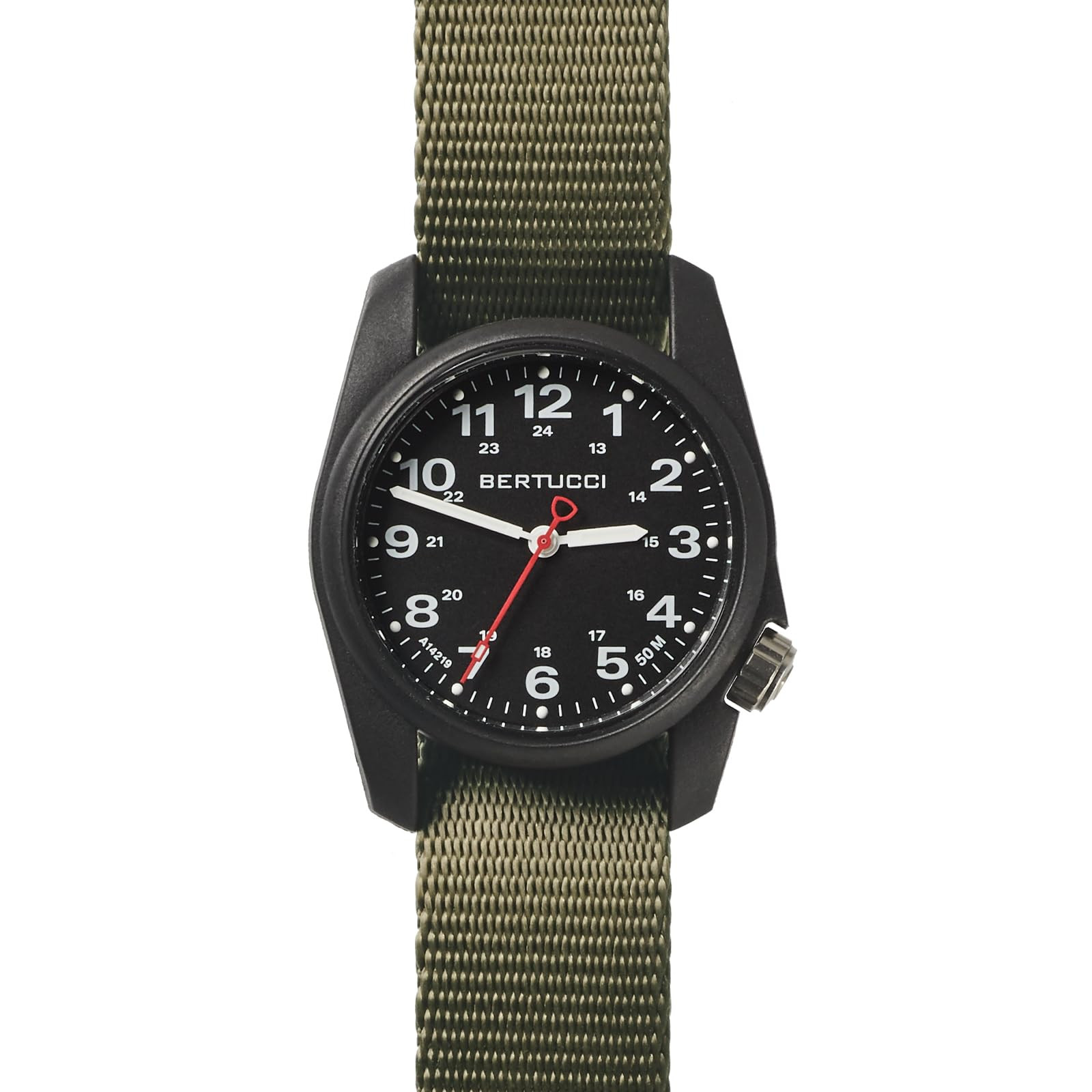 Bertucci A-1R Field Comfort Black Olive The A-1R Field Comfortâ was developed for light weight comfort in a traditionally sized 36 mm case... weighing an amazing 1.16 oz. / 33 grams. The core of the design is our rugged U.S. Patented fiber reinforced Unibodyâ case and our ultra-smooth Comfort-Webbâ band. Additionally, a 3 year battery, ergonomic off set crown, 50 M water resistance, scratch resistance R-Type mineral crystal, and precision movement. A watch that will last, and one that you wonât even know youâre wearing. Product Details Brand BERTUCCI Style Watches Product Type Watches Mpn 10501 Equipped with our legendary U.S. Patented fiber reinforced polycarbonate Unibody™ case for extreme durability and comfort Active Comfort™ ergonomic 4 o’clock crown does not impinge wrist movement Long lasting U.S. Patented Comfort-Webb™ band One size fits all to smaller - Powered by