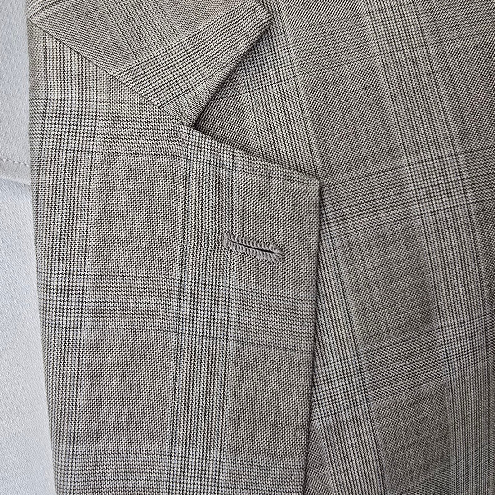Size: USA 44R with 26-inch arm length and a jacket length of 32 inches. For complete measurements, see photo #2 To see exactly how we measured, see the last series of photos. Condition: no signs of use. The front hip pockets are sewn shut. No flaws. No stains. No snags. No smells. 26 inch arm length, Full canvas, working cuff, medium shoulder pads, glenplaid with light blue undertones, 3.75 inch lapels, dual vent, light to midweight We ship the next business day after the payment is made. Return policy: We offer free shipping and no returns. We can not afford to offer both in the highest return category on eBay. It becomes very expensive to mail out items for free for people to try on if they are not confident in checking the measurements in picture #2. If you prefer to have the ability to return the item and pay $12.95 shipping, please send us a message, and we can change the listing format to offer returns. The $12.95 shipping cost would break us out even in the case you needed to return the item. ****24 inch arm length****