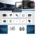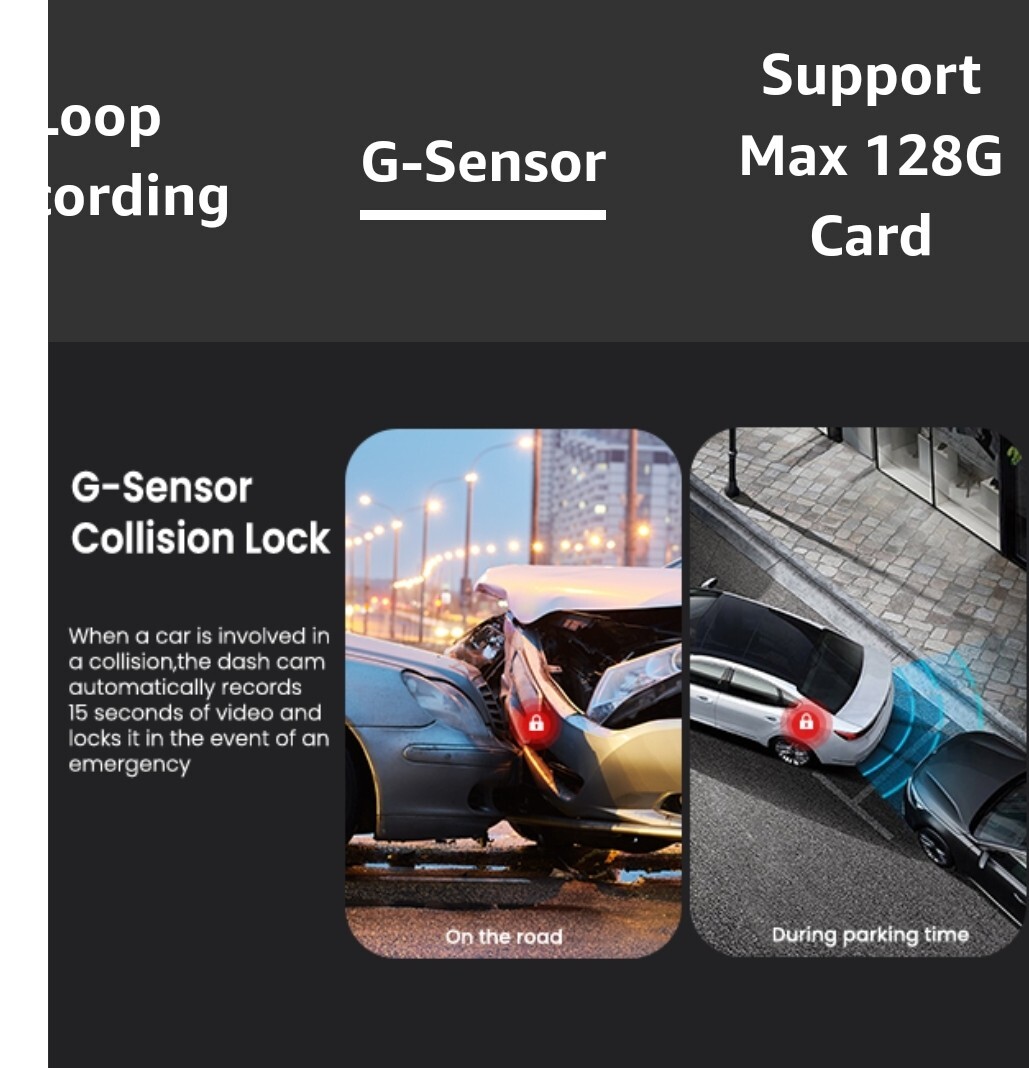 HD 4k wifi dash cam front and 1080 rear . App control smart dash camera dual dash camera driving recorder, WDR, wide angle, parking monitor, G-sensor, free 64GB card ( installed) USB. Android devices. Built-in display. Records videos in the app. G-Sensor detects a collision, will lock the accident video urgently. 24 hours parking monitor. G-Sensor to shoot the collision pictures and lock the video won't be deleted. Camera has super night vision. Manually adjustable camera exposure, capturing high quality images. Support 10 multi languages. Includes car charger, user manual, cable clip, installation tool, 3 inch screen size.