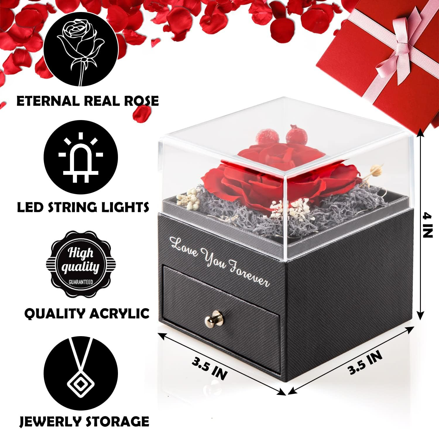Store New Arrivals Add to Favorite View Feedback Contact Best Wish Rose Preserved Flower With Jewelry Gift Box Love Necklace For Women Valentines Day Description Item model number Red Rose Assembly required No Batteries required Yes Item Weight 9.6 ounces Batteries 2 Lithium Ion batteries required. (included) Units 1 Count Package Dimensions 4.8 x 4.72 x 4.69 inches Number of pieces 1 Vintage No Closure Hook Occasion Valentine's Day Real Rose Gift -- This gifts for mom made of 100% real fresh rose. You will get a preserved red rose with led lights, Love You silver necklace with jewel case, a black heart-shaped blessing card and a gift bag. The rose and surrounding hay are made of fresh raw materials and can be stored in a dry place for 3-5 years at will without dimming in color. S925 Sterling Sliver Necklace - Preserved Rose and S925 silver heart necklace with a blessing card and gift bag. Unique gifts for women, the I Love You necklace in 100 Languages comes with the jewel case. You can turn on the flash light and aim at the back of pendant, 'I LOVE YOU' words will reflect on the wall. Gifts for Mom with LED -- Gifts for mom with never fading rose are equipped with LED batteries, just tap the touch switch and the LED light will decorate a warm and healing atmosphere to this gift for women. The cr2032 battery can keep bright for more than two days, easy to replace. Romantic Gifts For Women -- Sympathy gift worth giving, occasions gift ideas for women. Preserved real roses with necklaces are creative gifts for Mother's Day, Christmas, Valentine's Day, anniversaries and birthdays. Anniversary gift for her, mom, grandma, girlfriend and wife. Elegant Eternal Love -- The mother's day gifts of eternal rose express love deeper than the single words'I LOVE YOU'. The elegant stunning rose and heart shaped pendant will keep their memory alive for years. Sympathy gift worth giving, great mothers day gifts from daughter. Product Description ABOUT US We offer the best prices around on high quality products. Our E-store includes media such as books, movies, music and games while offering electronics, toys, sporting apparel, clothing, tools, general home, garden items and more. SHIPPING We are always working hard to ensure your package arrives as soon as possible. Please understand that some factors like weather, high postal traffic, and the performance of shipping companies are outside of our control. We offer free shipping to the lower 48 states and ship within 2 business days of payment, usually sooner. We do not accept P.O. Boxes. Please provide a physical address. For shipping outside of the continental USA, we only use eBay's Global Shipping Program.The item is shipped to KY and then sent to the rest of the world. International customers are responsible for all duties and taxes. Continue to 'check out' to calculate costs for shipping the item to your country. Messages regarding eBay's Global Shipping Program MUST be directed at eBay EXCLUSIVELY. RETURNS We offer a 30-Day Return Policy on items in which you are not completely satisfied with. You have the option of a full-refund or an exchange of the item. No returns are available on items shipped outside of the USA. PAYMENT We accept PayPal. CONTACT US This page content is yet to come Please ad us to your favorite seller and visit again later Thank You CUSTOMER SATISFACTION We try our very best to make sure every customer is completely satisfied. If there's a problem, message us! We're happy to help. WE ACCEPT Copyright © 2021 AutoDS. | All Rights Reserved