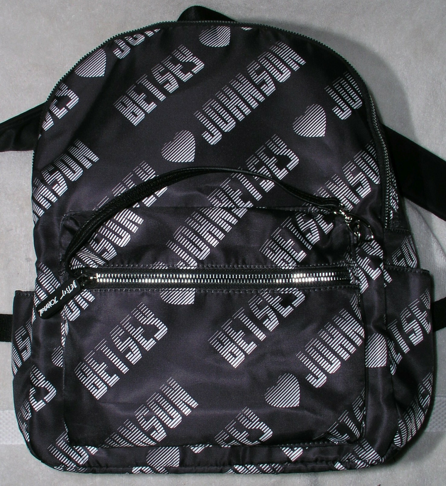 This is a new with tags (old stock) Betsey Johnson sporty logo handbag or purse in a black signature logo print showing "Betsey Johnson" and hearts with black faux leather trim and signature Betsey Johnson silver rose print satin lining. The exterior of the bag is done in a Betsey Johnson signature logo in black with white writing with black vegan leather trim and silver tone hardware. The bag has an outside 7 inch tall, 9 inch wide, and 1 inch deep pocket that zips closed on the front, with a detachable faux leather strap that connects to a hidden matching zipper case inside the pocket. The whole purse also zips closed at the top. There are open pockets on the side panels as well. Inside the purse, is a silver signature print with roses lining with a zipper closure interior pocket. There are also two open pockets in the lining on the opposite side of the interior. The interior also has a Betsey Johnson faux leather label sewn into the lining. This bag is new (old stock) with tags and has no rips, tears, stains, or odors. The interior is pristine, as is the exterior. It is absolutely beautiful. The bag measures approximately 14" Tall X 11" Wide X 4" Deep and has adjustable (with a sliding buckle) cushioned straps on the back. This set of bag will be perfect for your collection of Betsey Johnson handbags. Make sure to check our store for other Betsey Johnson signature handbags. If you decide to buy more than one, (or other items in our store) message us with your list for a quote that will save you money. Please feel free to ask any questions you may have. WE SHIP for FREE (Available for items shipped to the continental 48 states only.) the same or next day, depending on the time of day we are notified of payment to get the item into your hands FAST, and always provide tracking! TO SAVE MONEY, and to see our other offerings, please cut and paste the URL link below, or click on the categories to the left on this page where you can see all, or search for specific items within our "store" to combine items if you wish. Message us with your choices for a quote that will save you money. We also offer return buyer savings. Thanks for looking, we list new items all the time, so please check back from time to time. Please message us if you have any questions or issues on our items after you receive them. We will be happy to work with you. Items not as described are the only items accepted for return. Item must be unused, or in the case of items sold as used, must be returned in the same condition in which it was shipped. https://stores.ebay.com/familyworks For sales, discounts and other information, please sign up for your newsletter at the top of our store page at the URL above (cut and paste to URL window). International Buyers - Please Note: Import duties, taxes, and charges are not included in the item price or shipping cost. These charges are the buyer's responsibility. Please check with your country's customs office to determine what these additional costs will be prior to bidding or buying.