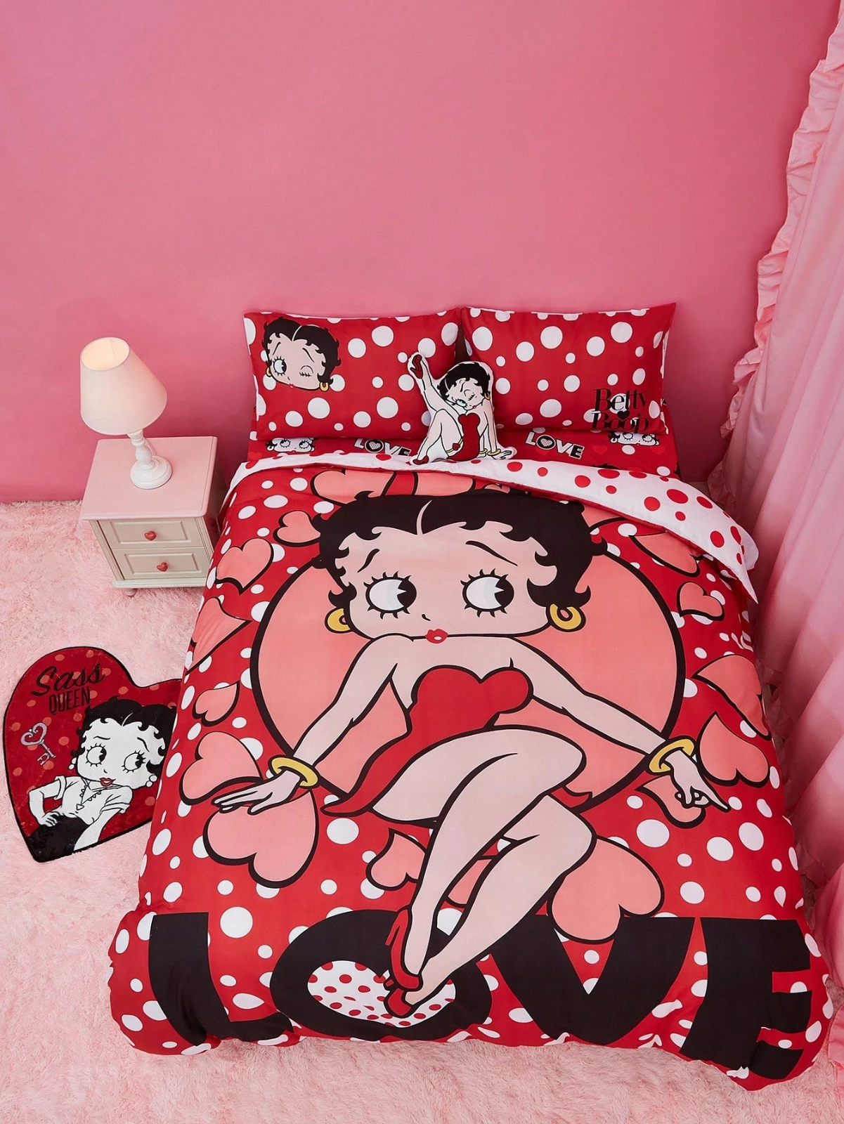 The Betty Boop Duvet Cover Set is a colorful and playful bedding set featuring the iconic character Betty Boop. Made for a bedroom, this comforter cover set is machine washable and easy to care for. Add a touch of nostalgia and charm to your space with the lovable Betty Boop character and her classic design.