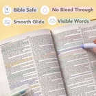 No Bleed, Soft Wax Formula: Our bible study supplies feature a soft wax gel that glides smoothly over thin Bible pages, ensuring no bleed-through, perfect for all your highlighting needs. Vibrant and Pastel Colors: Available in both vibrant and pastel color packs of 10, these bible highlighters and pens no bleed provide a wide range of colors to suit your style, ideal for Bible study, journaling, and note-taking. Perfect for Bible Study Supplies: Designed specifically for Bible enthusiasts, our gel highlighters are perfect for studying scripture, making notes, and highlighting important passages without damaging the pages. Long-Lasting and Smear-Resistant: Enjoy a clean and precise highlighting experience with highlighters for bibles that do not bleed. The wax-based gel formula is smear-resistant, ensuring your work stays neat and tidy. Portable and Easy to Use: Lightweight and easy to carry, these Bible highlighters are perfect for use at home, in church, or on the go, making them a versatile addition to your study supplies. Product Description Are they suitable for using on thin bible pages without bleeding? These 10 Bible Highlighters are carefully designed not to bleed through paper, including thin pages like those in the Bible. Do they dry out quickly if left uncapped? These Highlighters won't dry out if left uncapped! Can you read the words through highlighted words? Absolutely, although our highlighters have great pigmentation, they don't hide the text.