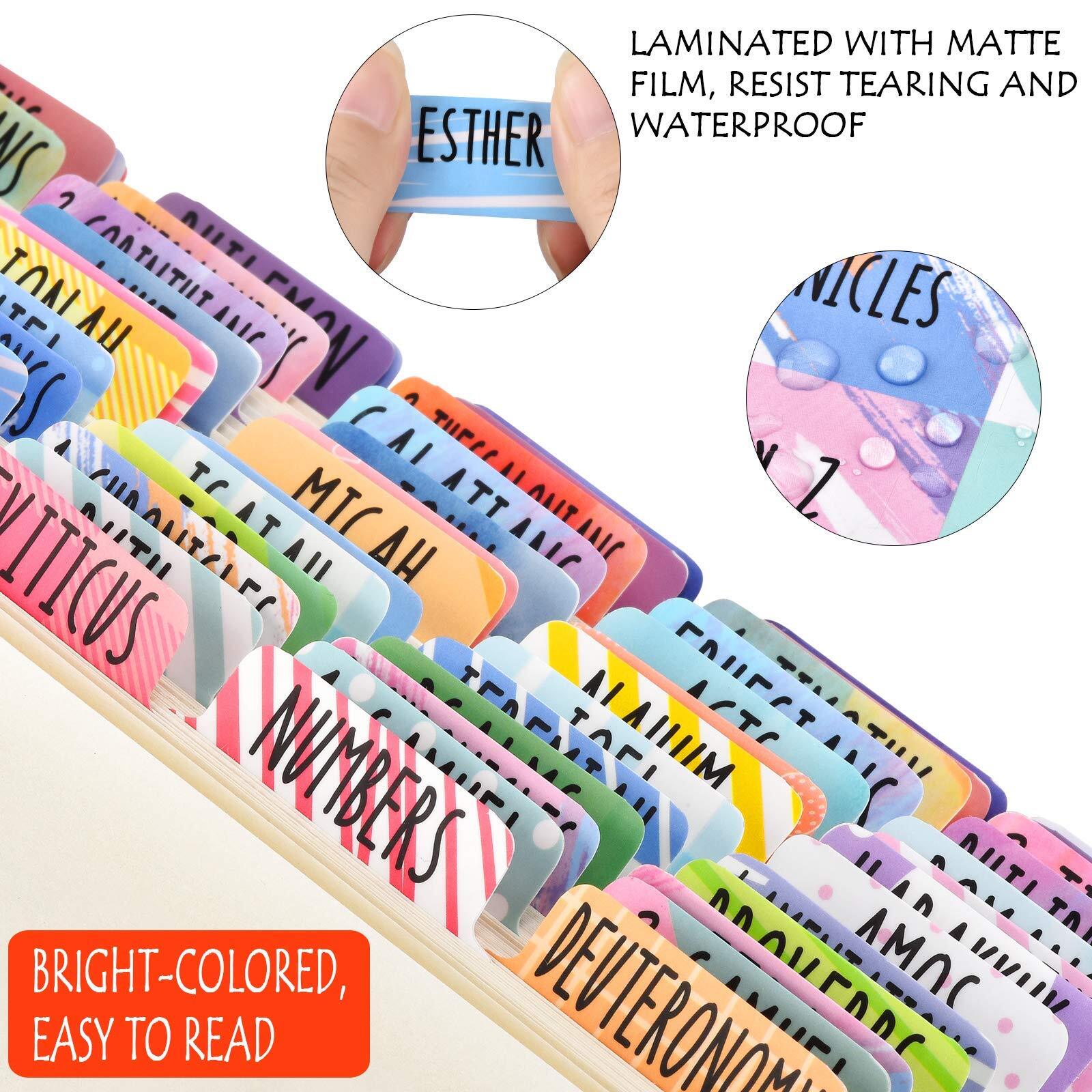 Bible Tabs Old and New Testament, Bible Tabs for Women/Men/Kids, 100 Pcs Bible Description: Package Contents: 66 Bible index tabs (1.5 x 0.5 inches) for all books of old and new testament. 14 Blank bible book tabs (1.5 x 0.5 inches). 1 Tab positioning guide. Features: Easy to apply and remove: The self-adhesive book tabs are easy to peel off and stick. You can line them up properly with the alignment guide that comes with the package. Each tab is pre-scored for easy folding. If you need to reposition, you can pull it off easily without tearing pages. A bonus Bible Book List is perfect for you to refer while applying. Unique design of perfect size: Our designer herself enjoys studying bible very much, and each bible tab is uniquely designed with multiple modifications. They are of suitable size and thickness that won’t make your bible look bulky. Easy to read and navigate: Dark writing with beautiful backgrounds making them easy to read with an elegant look. Perfect for Bible journaling and Bible study. Durable and waterproof: These bible tabs are sturdy, at the same time, flexible. They are laminated for protection, which makes them waterproof and durable. For old and new testament: There are 100 bible index tabs in this set, 66 tabs for old and new testament, 7 for catholic books, 8 for reference and 19 blank ones with unique design that can be personalized or used to index other books. SHIPPING We are always working hard to ensure your package arrives as soon as possible. Please understand that some factors like weather, high postal traffic, and the performance of shipping companies are outside of our control. We offer free shipping to the lower 48 states and ship within 3 business days of payment, usually sooner. We do not accept P.O. Boxes. Please provide a physical address.