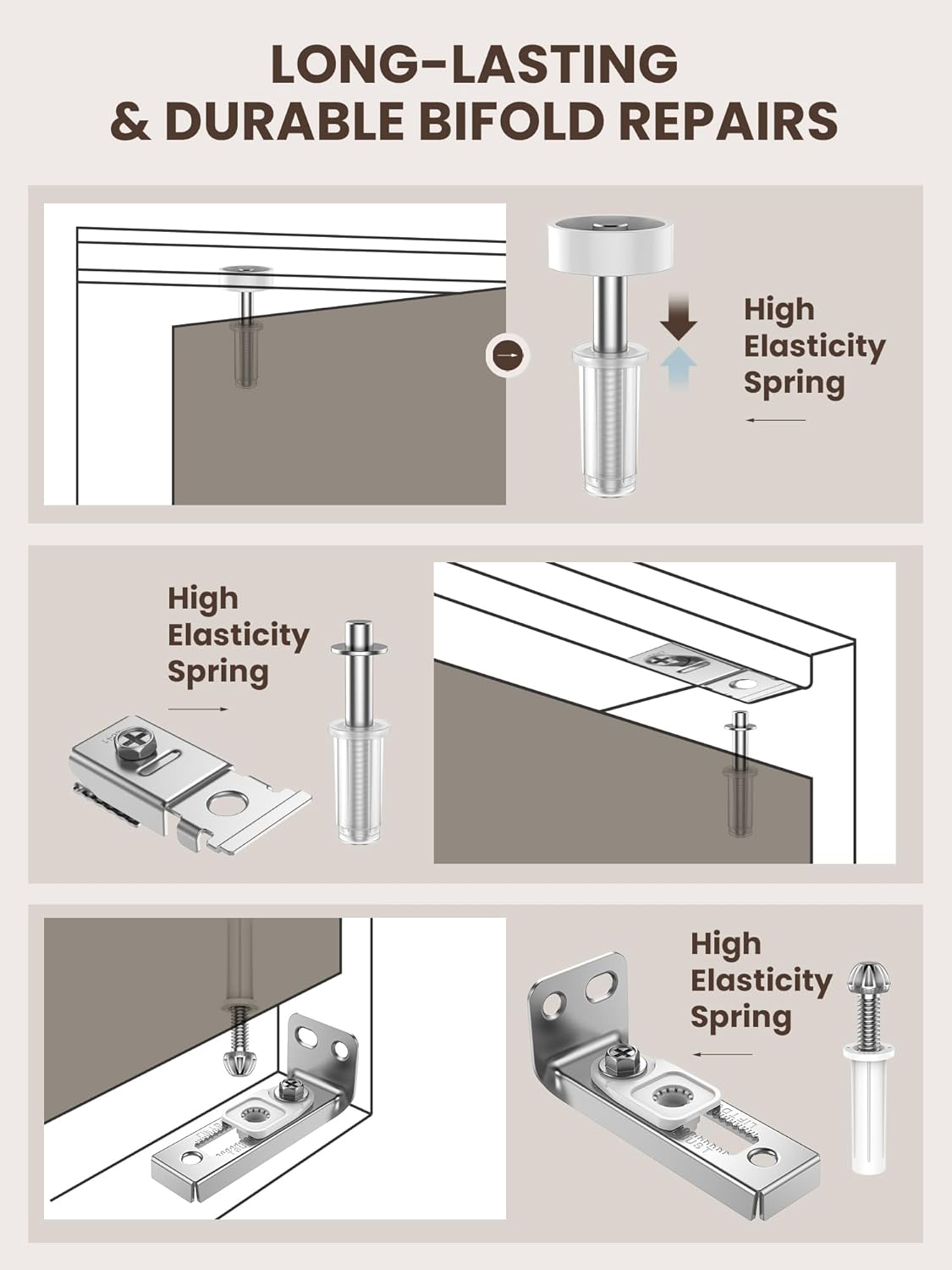 Store New Arrivals Add to Favorite View Feedback Contact Bifold Door Hardware Repair Kit - 2 Pack Bi-Fold Sliding Closet Door Hardware Kit for 7/8" to 1" Track, Folding Pocket Door Replacement Parts Set Include Top Bottom Pivots Bracket and Guide Wheel Description Item model number BU-ZDM-2P01 Part Number BU-ZDM-2P01 Batteries Required? No Size 2 Pack Item Package Quantity 1 Color Silver Product Dimensions 3.93 x 3.74 x 1.37 inches Item Weight 7.8 ounces Batteries Included? No Manufacturer BUDONI Size Name 2 Pack Included Components 2 x bottom pivot brackets; 2 x top pivot brackets; 2 x 7/8” plastic guide wheels; 2 x bottom pivots Complete Range of Folding Door Hardware Repair Kit Parts: 2-Pack Bifold door hardware kit includes 2 top metal pivots, 2 top plastic pivots, 2 bottom pivots, 2 x 7/8" plastic guide wheels, 2 bottom pivot brackets, 2 top pivot brackets, 6 mounting fasteners, and 1 installation manual. Closet door hardware kits can quickly and easily repair doors weighing up to 50 lbs. and with thicknesses ranging from 1" to 1-3/8", suitable for 7/8"-1" wide track. (Please note: Track and hinges are not included.) Easy Installation for Quick Restoration of Old Doors: BUDONI Bi-fold closet door hardware repair kits include all the necessary hardware parts along with easy-to-follow detailed installation instructions, making the installation and replacement of damaged parts hassle-free. You don't have to be a professional to easily repair a broken folding door and restore your closet doors to their former glory. Say goodbye to expensive repairs and hello to smooth sliding bifold doors. Robust and Long-lasting Materials: Bifold door hardware made of stainless steel and nylon PA6 plastic material, enduring, to avoid frequent sliding leading to broken accessories or folding door tilt or even fall, to extend the service life of the folding door. The pivot and guide wheels of the hardware repair kit come with springs that prevent sliding jams, ensuring that your folding doors slide easily and smoothly, bringing new life to your closet sliding doors. Bring New Life to Your Doors: This bifold closet door repair kit is versatile, allowing you to quickly repair old doors without replacing the entire door with just replacement parts, giving any room a new look perfect for a quick and easy home renovation. With this folding door hardware repair kit you can quickly give your bi-fold cabinet doors, closet doors, sliding doors, pocket doors, garage doors, barn doors, accordion doors, laundry room doors, storage room doors and more a new look. Installation Manual Included and Worry-Free After-Sales Service: Our bifold door repair kits come with an installation manual that contains a list of accessories, installation steps and diagrams to guide you through the process. In addition, for all size information, please refer to the size pictures and compare them with your needs before purchasing. If you encounter any problems during the purchase and use process, we are ready to help you until you are satisfied. Product description ABOUT US We offer the best prices around on high quality products. Our E-store includes media such as books, movies, music and games while offering electronics, toys, sporting apparel, clothing, tools, general home, garden items and more. SHIPPING We are always working hard to ensure your package arrives as soon as possible. Please understand that some factors like weather, high postal traffic, and the performance of shipping companies are outside of our control. We offer free shipping to the lower 48 states and ship within 2 business days of payment, usually sooner. We do not accept P.O. Boxes. Please provide a physical address. RETURNS We offer a 30-Day Return Policy on items which you are not completely satisfied with. You have the option for a full-refund or an exchange of the item. No returns are available on items shipped outside of the USA. PAYMENT We accept PayPal. CONTACT US This page content is yet to come Please ad us to your favorite seller and visit again later Thank You CUSTOMER SATISFACTION We try our very best to make sure every customer is completely satisfied. If there's a problem, message us! We're happy to help.