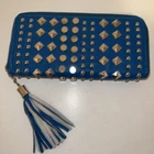 Add some sparkle to your everyday look with this stunning blue studded wallet. Crafted from high-quality silver-tone metal, this wallet features a hanging tassel and multiple slots for your phone and cards. It speaks of biker/hippie in its studded silver accents. Its stylish design is perfect for any occasion, whether you're running errands or going out for a night on the town.