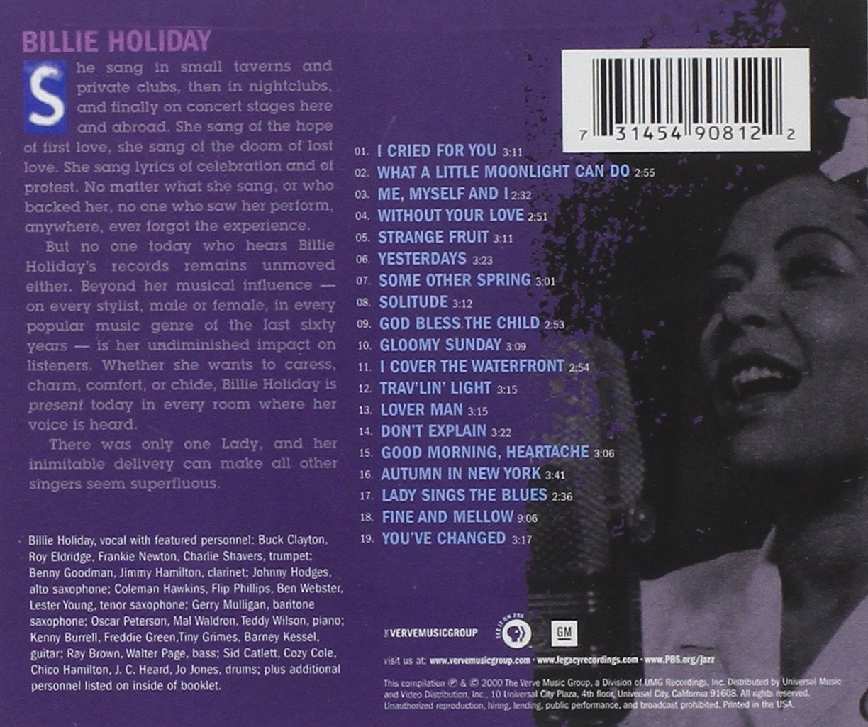 Further Details Title: Ken Burns Jazz: Billie Holiday Condition: New Format: CD EAN: 0731454908122 Description: Holiday,Billie Ken Burns Jazz This greatest-hits collection accompanies Ken Burns's 10-part documentary Jazz and shows that though she never practiced the vocal gymnastics of an Ella Fitzgerald, Billie Holiday was unquestionably among the greatest jazz singers, with a subtle inventiveness in phrasing and note choice and a tremendous capacity to swing. This collection covers virtually the entire career of a fascinating and troubled artist, beginning with her sparkling mid-1930s recordings with pianist Teddy Wilson and the cream of swing-era horn players. While those fresh-voiced early records already indicate Holiday's capacity for conveying the nuances of a lyric, her work soon took on greater drama. "Strange Fruit," a 1939 account of a lynching, marked a breakthrough in the popular song, as well as in Holiday's career, and her controlled intensity only becomes more marked on signature songs like the wistful "God Bless the Child" and the moving "Don't Explain." Holiday's voice deteriorated in the later 1950s, but performances like "Fine and Mellow" show that her emotional power and musicality remained intact. --Stuart Broomer Genre: Pop Artist: Billie Holiday No Of Discs: 1 Language: English Release Date: 2000 Record Label: Verve Release Year: 2000 Missing Information? Please contact us if any details are missing and where possible we will add the information to our listing.