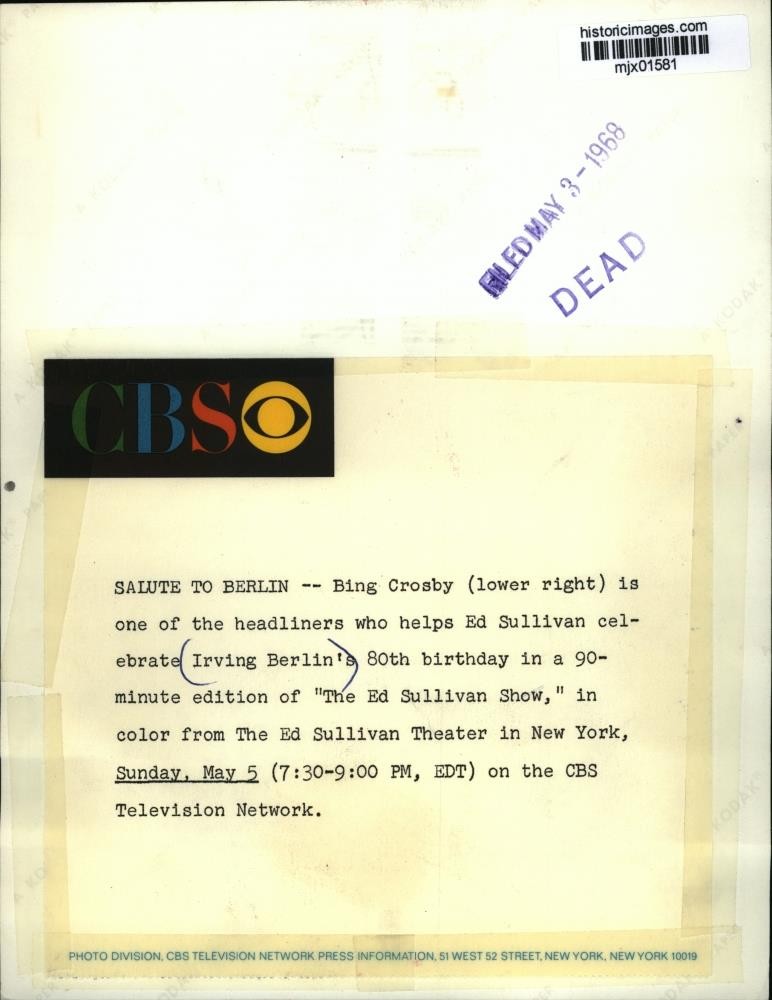 ebay template Note: Please study the images carefully to determine the condition of this vintage photograph, as it may not be in perfect condition. It may contain wrinkles, cracks, and possibly even tears due to its age and how it was handled before it got to us. A scanner may interpret colors and contrast differently than human eyes will, so it is possible that the actual photograph may be slightly darker or lighter in person. This vintage photograph is offered for sale as a collectible item and conveys no transfer of copyright. 1968 Press Photo Bing Crosby Celebrates Irving Berlin on The Ed Sullivan Show This is an original press photo. Salute to Berlin -- Bing Crosby (lower right) is one of the headlines who helps Ed Sullivan celebrate Irving's Berlin's 80th birthday in a 90-minute edition of "The Ed Sullivan Show," in color from The Ed Sullivan Theater in New York, Sunday May 5 (7:30-9:00 PM, EDT) on the CBS Television Network.Photo measures 7 x 9.25inches. Photo is dated 05-03-1968. PHOTO FRONT PHOTO BACK Historic Images Part Number: mjx01581 Sell Smarter with Kyozou. Inventory and Ecommerce Management