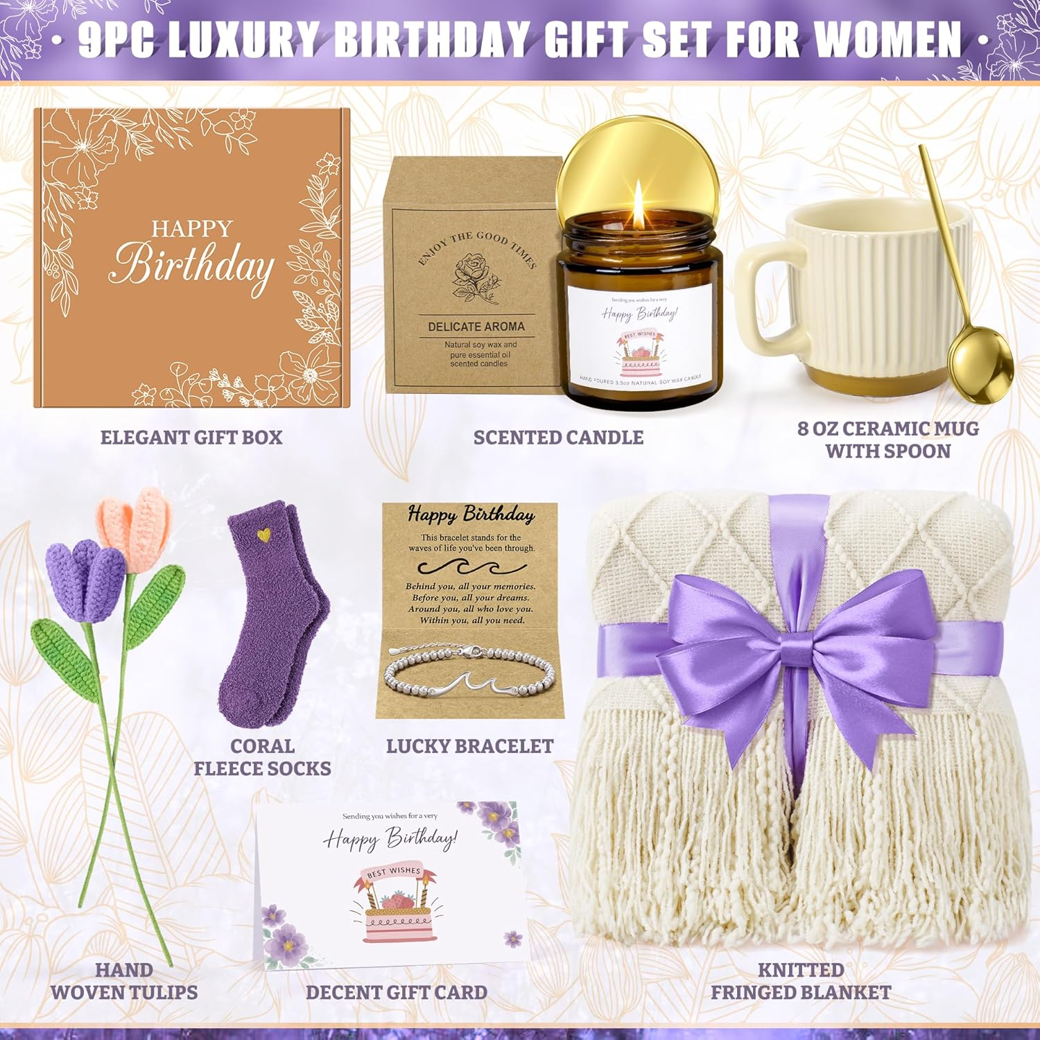 Store New Arrivals Add to Favorite View Feedback Contact Fast deliveries to the customer's home Quality customer service John Make the customers happy! Birthday Gifts for Women, Unique Happy Birthday Gift Basket, Self Care Gift Care Package, Women Gifts for Birthday Box for Her Mom Grandma Sister Best Friend Wife Girlfriend Coworker Description 【Happy Birthday Gift Basket for Women】This luxurious birthday basket for women includes a minimalist ceramic mug with spoon, charming bracelet, bluebell-scented candle, purple socks, birthday gift card, hand woven tulips, and a fringed knitted blanket - everything to make her feel cherished. 【Unique Gift Baskets for Women Birthday】Great birthday gift idea for yourself, female, bestie, bff, best friends, girlfriend, sister, sister in law, mom, mother in law, wife, lady, grandma, gigi, nana, aunt, daughter, daughter in law, teacher, employee, boss, niece, nurse, neighbor, coworker. 【Perfect Womens Birthday Gifts for Any Occasions】This exquisite womens birthday gift basket relaxing gifts is specially curated to celebrate all awesome women.This beautiful birthday box for woman is sure to surprise her and brighten her day! Perfect as 21st, 30th, 40th, 50th, 60th, 70th, 80th, 90th, 100th milestone birthday or any bday in between. Great gift for Valentine's Day, Thanksgiving, Mother’s Day, Christmas, going away, retirement, wedding, anniversary, sympathy gift baskets, birthday gift cancer patient after surgery, mommy care package after birth. 【Wrap Her in Thoughtful Comfort】The ultra-soft chunky knitted blanket becomes her – perfect as cozy recovery gifts for her post-surgery or late-night movie snuggles. Paired with the minimalist ceramic mug, this delivers silent companionship. Pink Tulip means caring, good wishes and purple symbolize elegance and admiration, for the extraordinary person who shines with uniqueness. Ideal for emotional support gifts for women battling stress, long-distance friendship care packages, or get well soon presents for wife – because real care whispers through everyday warmth. 【A Gift That Speaks Her Love Language】 This curated box shines as women gifts for birthday, self care gifts for women, and best friend birthday gifts for women. Whether crafting the ultimate care package for women in recovery, surprising your soul sister with best friend gifts for women, birthday gifts for mom or gifting relaxation gifts for nights, every item – from the stress-melting candle to the wave bracelet – whispers: “You’re cherished.” Product description Bluebell Scented Candle Floral Enjoy, Calming Moments: This soy wax candle releases a soft bluebell scent – like a deep breath of calm. Perfect for relaxing gifts for women, gift set for women birthday, or unwinding after a festive day. Birthday Bliss Ceramic Mug This mili mug holds 8oz of warmth—perfect for birthday morning coffee, cozy tea moments, or gifting in curated self care sets. Cozy Birthday Hug Socks Crafted from premium coral fleece, these lavender socks feature a hidden embroidered yellow heart – a tiny surprise that says "you're loved" with every step. Perfect for chilly birthday mornings, post-spa relaxation, or adding warmth to self-care gift boxes. Knitted Tulips This pair of crocheted tulips features a lavender bloom and a blush pink companion, each with gently curled petals and flexible stems ready to grace birthday gift boxes, desk vignettes, or memory shelves. Perfect as moms birthday gift ideas, birthday gifts for women, birthday baskets, birthday gift for mom from daughter, birthday gift for mom from son, teacher birthday gift, birthday gift ideas, for women over 50, gift basket for women birthday, gift set for women birthday, get well gift baskets for women birthday, tulip gifts for women Item model number GF006 Item Weight 1.35 Kilograms Use for Whole Body Skin Type All Item Form Liquid Package Dimensions 10.91 x 10.79 x 4.09 inches; 2.98 Pounds ABOUT US We offer the best prices around on high quality products. Our E-store includes media such as books, movies, music and games while offering electronics, toys, sporting apparel, clothing, tools, general home, garden items and more. SHIPPING We are always working hard to ensure your package arrives as soon as possible. Please understand that some factors like weather, high postal traffic, and the performance of shipping companies are outside of our control. We offer free shipping to the lower 48 states and ship within 2 business days of payment, usually sooner. We do not accept P.O. Boxes. Please provide a physical address. For shipping outside of the continental USA, we only use eBay's Global Shipping Program. The item is shipped to KY and then sent to the rest of the world. International customers are responsible for all duties and taxes. Continue to 'check out' to calculate costs for shipping the item to your country. Messages regarding eBay's Global Shipping Program MUST be directed at eBay EXCLUSIVELY. RETURNS We offer a 30-Day Return Policy on items in which you are not completely satisfied with. You have the option of a full-refund or an exchange of the item. No returns are available on items shipped outside of the USA PAYMENT We accept PayPal. CONTACT US This page content is yet to come Please ad us to your favorite seller and visit again later Thank You CUSTOMER SATISFACTION We try our very best to make sure every customer is completely satisfied. If there's a problem, message us! We're happy to help. WE ACCEPT