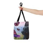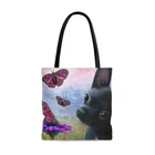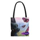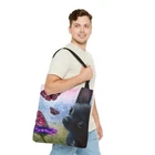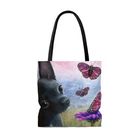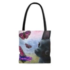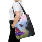 Great Tote bag with a print of my artwork. Available in three sizes: small 13x13 inches, medium 16x16 inches or large 18x18 inches, measured flat. 100% Polyester Boxed corners Black inner stitching, transparent thread on hems. Black cotton handles Image on both sides Colors may slighlty vary due to your monitor settings. Printed and shipped from USA, please allow production time before shipping.