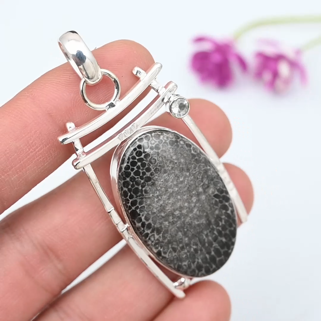 Black Coral Fossil, White Topaz Pendant 925 Sterling Silver Handmade Jewelry