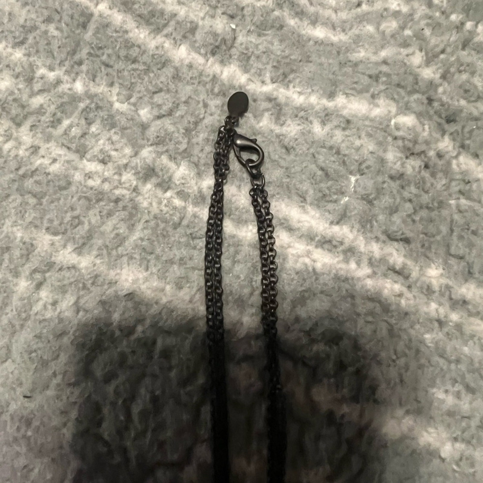 Black metal cross necklace in excellent used condition. Features a bold gothic-style cross pendant with decorative detailing and a double chain design. Great statement piece for everyday wear or layered looks. Details: • Chain length: 16” total (including pendant drop) • Pendant size: Approx. 2.5” tall • Metal: Black tone • Chain style: Double chain • Condition: Excellent used condition Perfect for: • Gothic style outfits • Statement jewelry • Layered necklace looks • Religious jewelry collectors Smoke-free home.