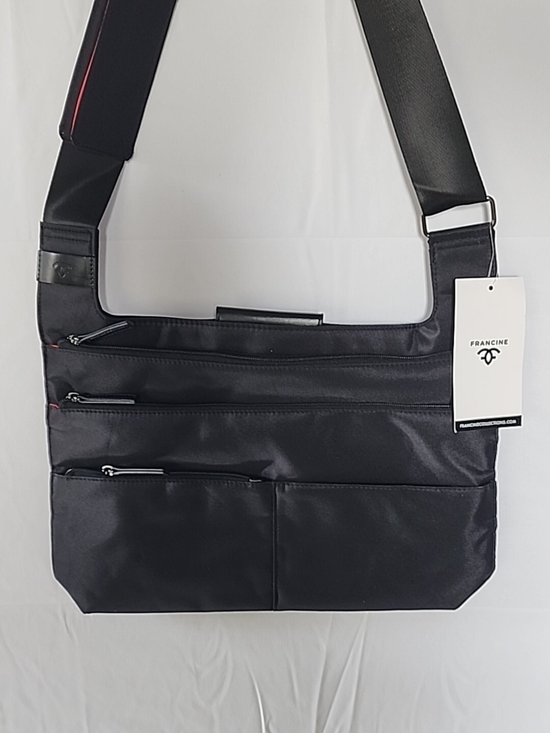 Francine Women in Business Montana Slim Crossbody Black Bag. Black Nylon with red lining gunmetal hardware. Adjustable Crossbody strap with non-slip shoulder pad. Fits up to 14" laptops. Vegan leather accents. Several front zipper pockets. 15"W x 13.5" H x 2.5" D. New with tags. Retail $50. Free Shipping.(5)