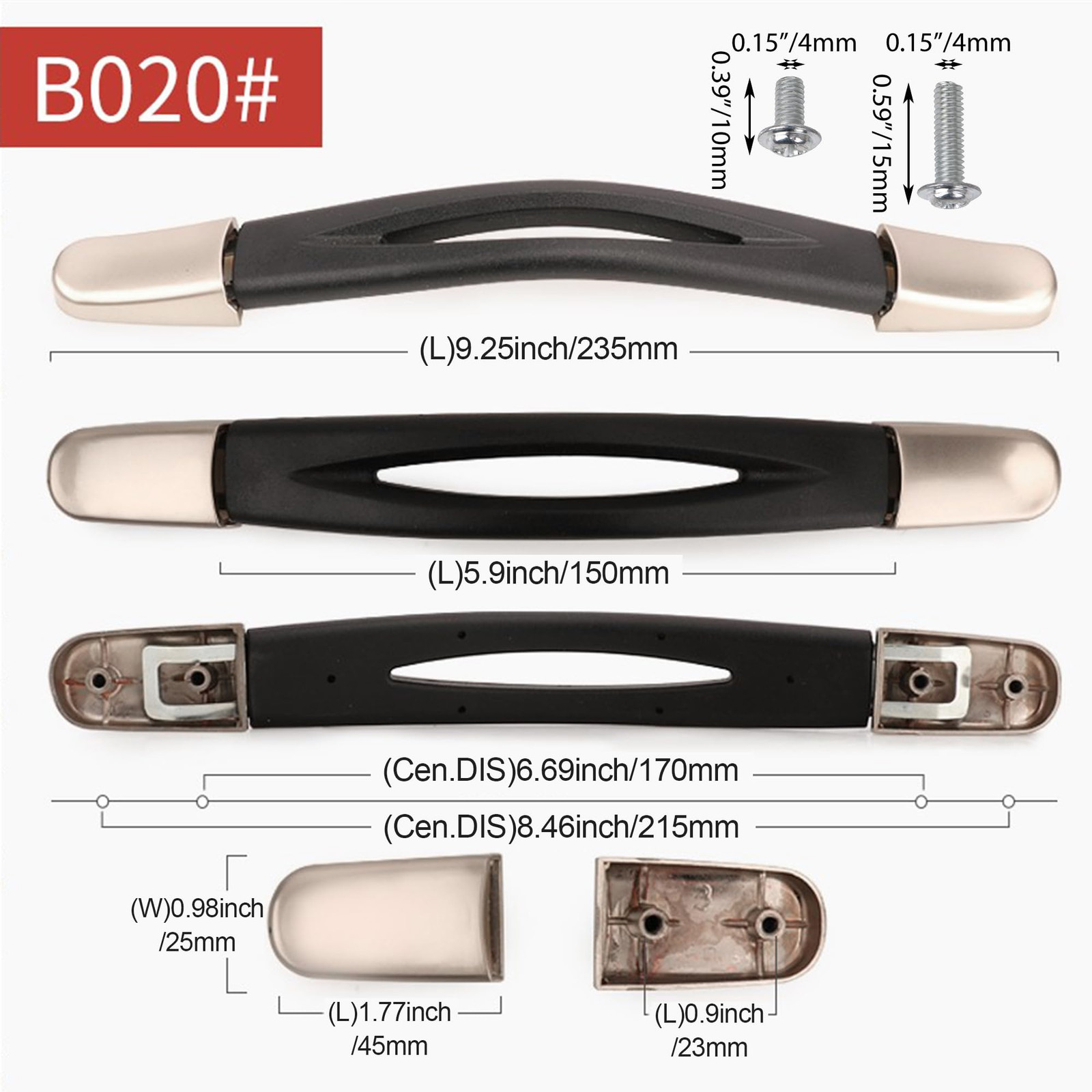 "Specifications: Material: Zinc alloy & PVC & Steel sheet Color: Black and Silver Size: Suitcase handle length: 225x25mm/8.85x0.98inch Handle strap length: 150mm/5.9inch Inner hole distance: 165mm /6.49inch Outer hole distance: 210mm /8.26inch Metal end cap: 48x26mm/1.88x1.02inch(LxW) Hole distance: 25mm/0.98inch Weight: 136g Features: 1.The surface is covered with film, which makes the surface for long term use, comfortable to grip and further improves the wear resistance. 2.It is equipped with the screws, plates and screwdriver that you need, which is make it easier to install. 3.Widely used for box, case, luggage, suitcase, ideal replacement for your old broken handle. 4.Replacement design, comfortable contoured grip, smooth without burrs. 5.Built-in steel sheet, ergonomics, frosted feel. Package List: 1 x Suitcase Handle 2 x Metal End Cap 4 x Screw Gasket 4 x Screws 1 x Screwdriver with a Cross and a Flat Head" Package include: 1 x suitcase handle, 2 x metal end caps, 4 x screw gaskets, 4 x screws. The package contains a screwdriver (the screwdriver is dual-purpose, one end is flat and the other is cross), you can DIY your luggage handle at any time. Spare Handle Strap length:about 15cm/5.91 inch Easy to install,you can attach them with screws Material: zinc alloy,PVC and steel sheet It can be widely used for suitcase,box,luggage,case