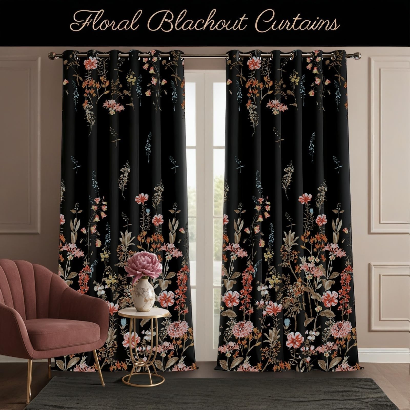 Black Floral Blackout Window Curtains 84 inch Length 2 Panels Set,Full Light Blocking Drapes,Room Darkening Curtains with Grommet Top,Thermal Insulated,Curtains for Living room,Bedroom. 1.【PACKAGE INCLUDES】Our black floral window curtains drapes 52*84 inch length 2 panels set.Used home decor living room. 2.【BLACKOUT & UV PROTECTION】Our thermal curtains by adopting the dual anti-glare technology,it can block 70%-90% of sunlight and ultraviolet rays,creating a perfect dark room environment. 3.【DESIGN & INSTALLATION】Our light blocking curtains easy-glide grommet top,includes 6-8 rustproof metal grommets(1.6” inner diameter)for smooth sliding on standard rods. 4.【MACHINE WASHABLE】Our thermal blackout curtains machine wash in cold water,tumble dry low,and iron on gentle settings.-resistant for lasting elegance. 5.【MULTI-ROOM COMPATIBILITY】Our thermal curtains for summer heat.Perfect for bedrooms,nurseries,living rooms,or patio doors.Pair with sheer curtains for layered decor.