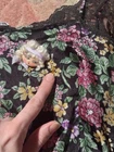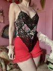 Black Lace & Floral Satin Bodysuit by Vassarette, Size M-L ౨ৎ Bust: 34”-40” ౨ৎ Waist: 28”-36” ౨ৎ Length (from top of strap to crotch): 30” Striking and ultra femme, this bodysuit features sheer black floral lace over the bust and down the front, meeting a saturated satin floral back. The delicate spaghetti straps (not adjustable) and deep V neck enhance the romantic cut, and the bottom closes with snaps. Slight stretch throughout. Good vintage condition with one of three snaps at the crotch missing (see photos), but still wearable as-is or easy to repair. Some runs down the back, but not noticeable when worn. ౨ৎ Model Stats: Bust 34C, Waist 30”, Hips 44” lace teddy, floral lingerie, sheer mesh bodysuit B3