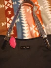This Black Lancome Paris Tote Bag with a Pink Lip Charm is a stylish and chic accessory for women. The black exterior and lining, along with black hardware accents, give this tote a sleek and sophisticated look. The faux leather handle/strap adds a touch of luxury, while the lightweight design makes it easy to carry. The playful pink lip charm adds a fun and feminine accent to the overall Paris-themed design. Pair this tote with any outfit for a fashionable and chic look.