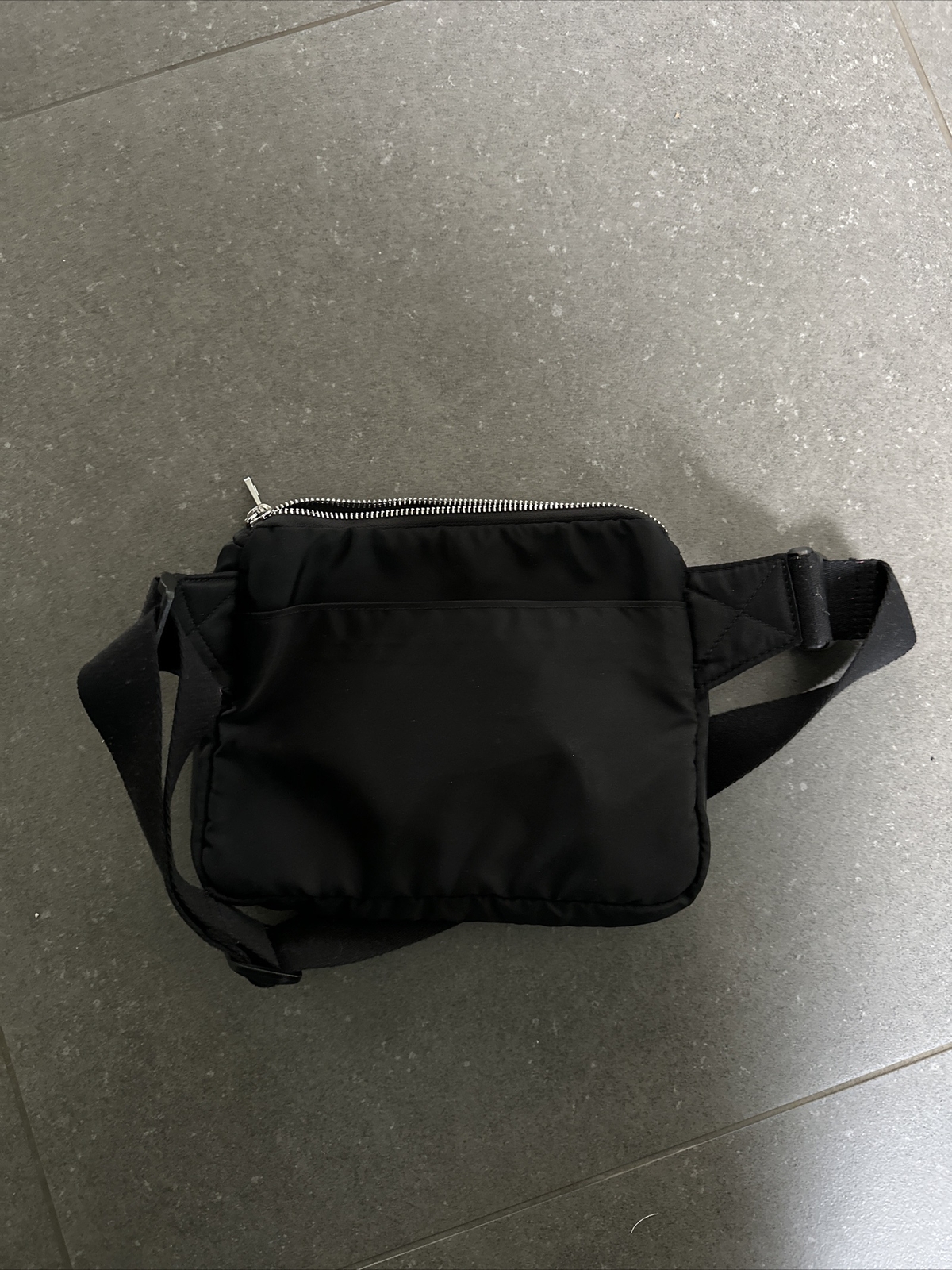 Black nylon cross body bag with two large zipper pockets and a back pocket. Used in Disney and was great.