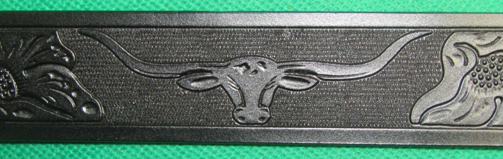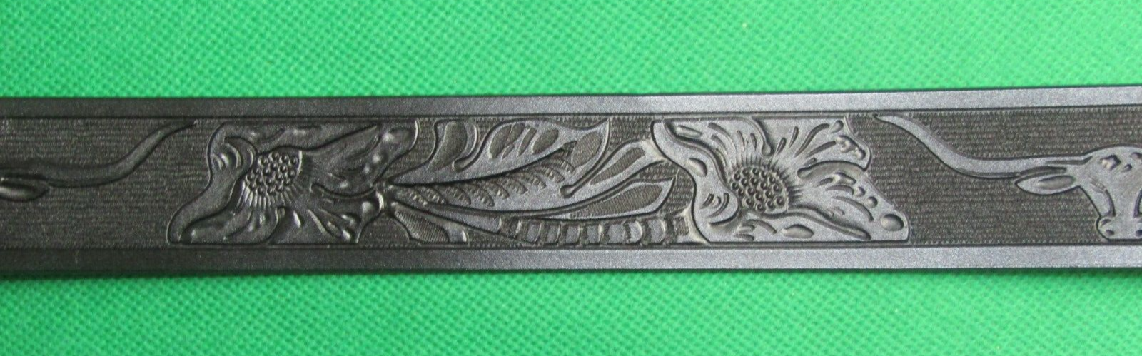 Leather Belt featuring a striking Longhorn Bull + Flora design, perfect for a touch of Rodeo-inspired flair. Made from high-quality black leather with embossed accents, this 120 cm long belt can be cut to size for a custom fit. The belt is approximately 3.7 cm wide and features a unique Bull + Flora theme, adding a touch of Western charm to any outfit. Adjustable and suitable for both men and women, this belt is a stylish accessory for any wardrobe. Choose and buy a nice Bulls Buckle to go with this stunning belt to create your personal belt! Free shipping available for this unique piece.