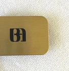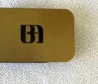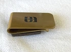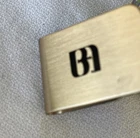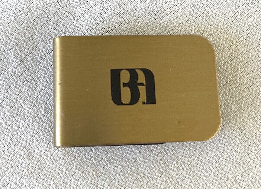 Money Clip with Initial BA in Black Letters. Have no idea what the BA stands for. The side that is all metal has a small area that is smudged. Last picture shows this defect. The side that is fine the initials appear to be recessed in wood, but I think it is just probably plastic are similar substance made to look like wood. A very cool money clip.