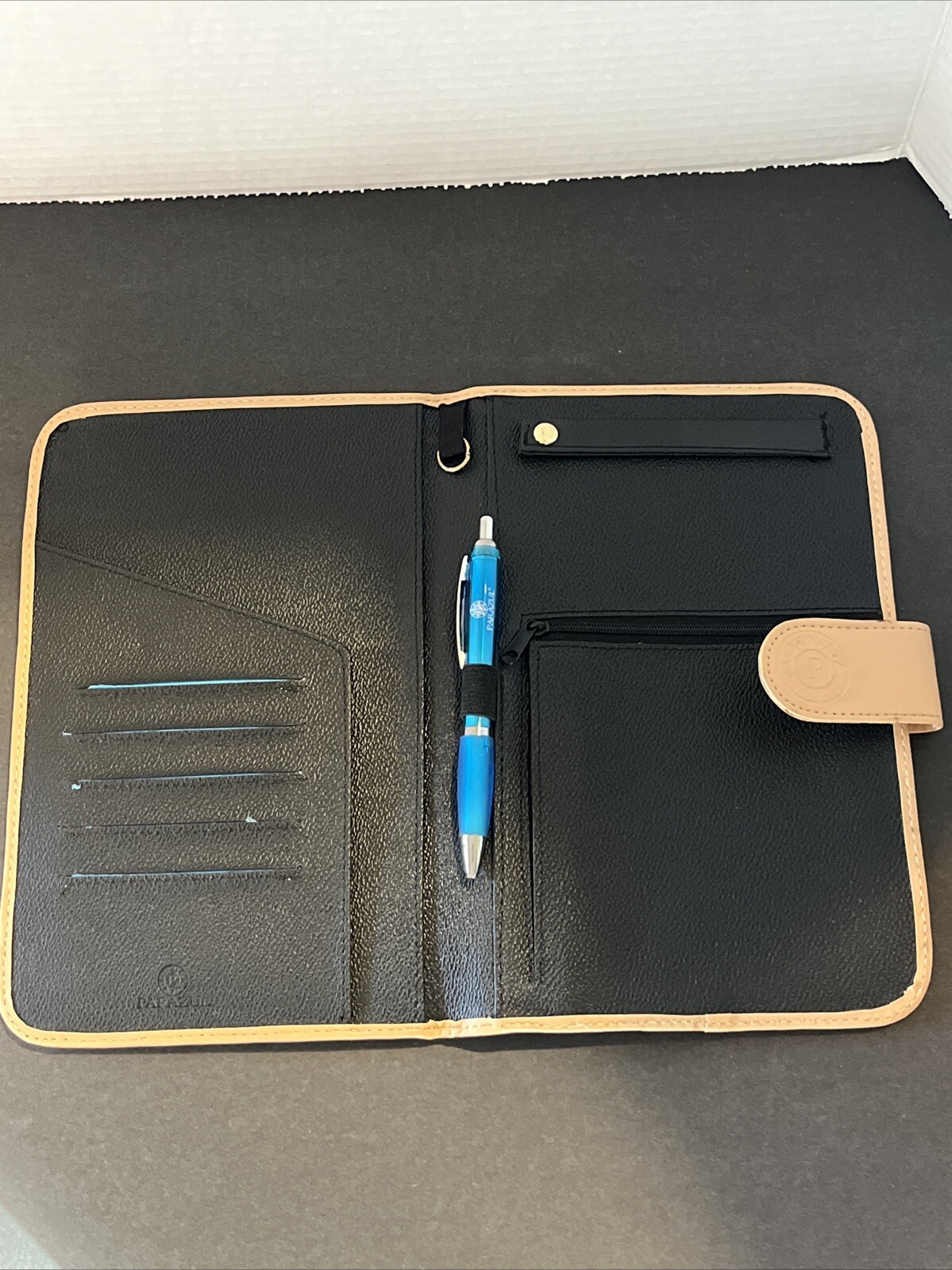 This travel organizer is a lifesaver for keeping everything secure and easy to find! The black design is sleek, and even though the closing strap shows slight wear, it’s still sturdy and works perfectly. Plenty of slots for passports, cards, and boarding passes—super handy for stress-free trips. Highly recommend!