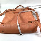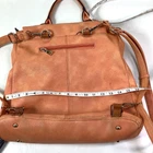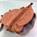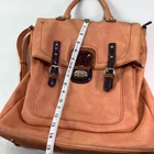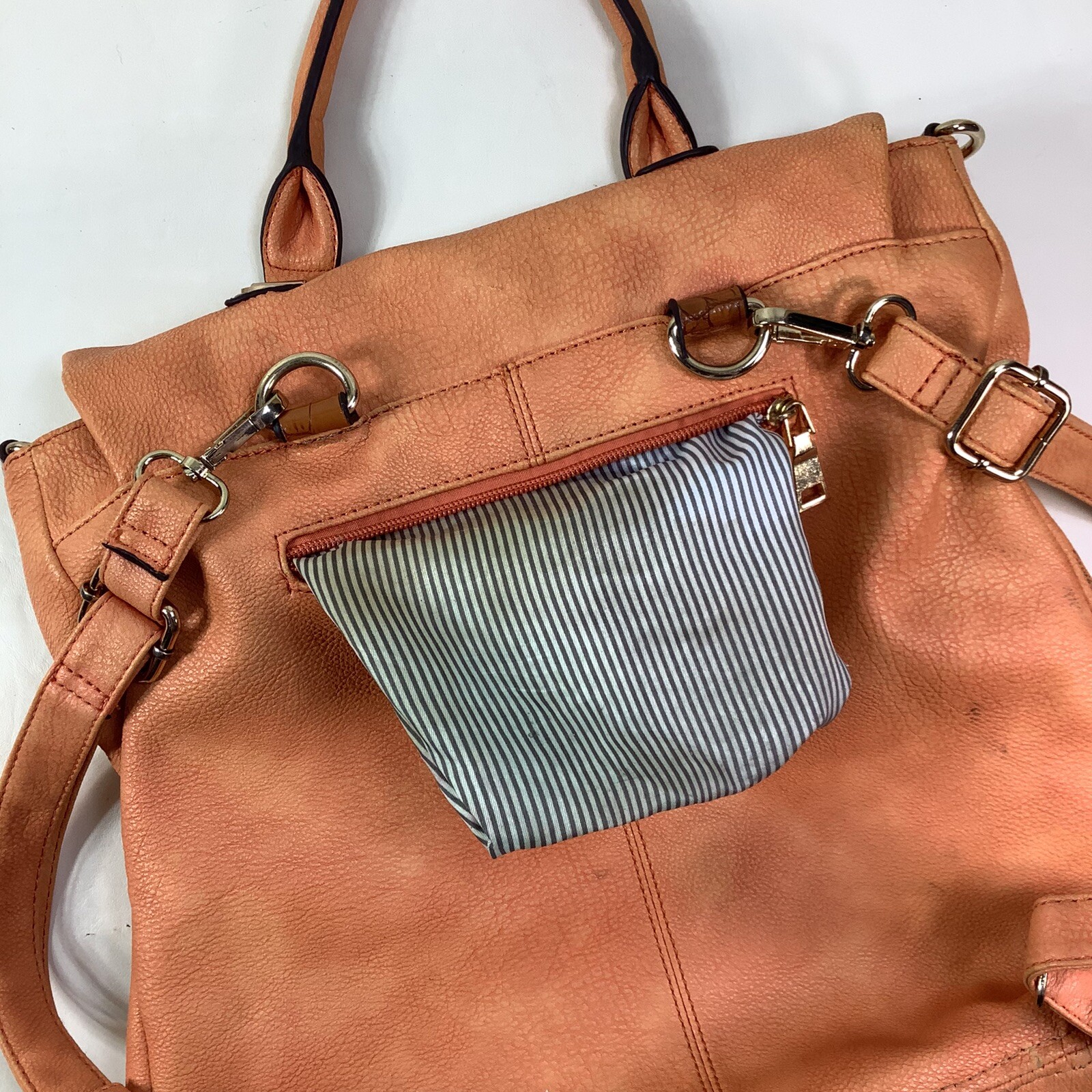 Handbag Backpack By Black Rivet Lots of Zip Pockets Orange Cream Color Measurements in item specific list are approximate and method of measuring shown in pics PLEASE READ ALL & SEE ALL PICS FOR DETAILED INFO READ ALL: Bag looks good, has some minor wear, I will explain. The zip pouch on back and the inner zip pouch has a light stain on the inside fabric. It looks like maybe a spill or perhaps someone let their makeup leak and this is the remaining stain after cleaning. On the bottom near where the backpack strap meets the bottom of bag there is a couple of small worn spots. (see pic #3) Overall a nice bag and has an awesome color that is probably hard to find. I do believe the bag exterior is a faux leather.