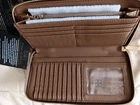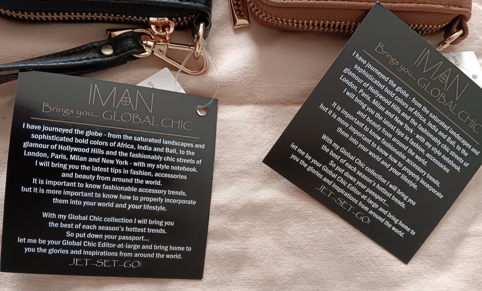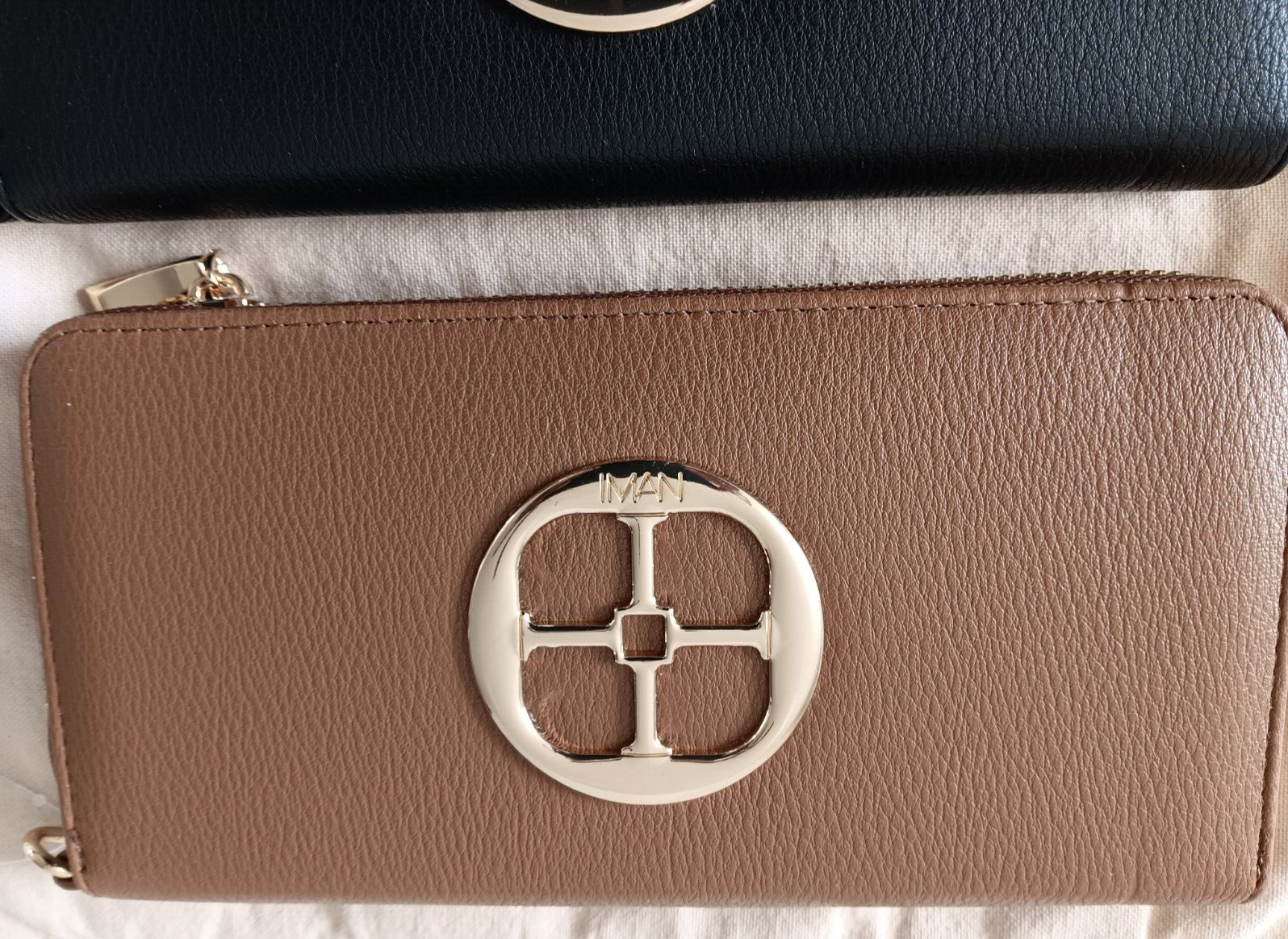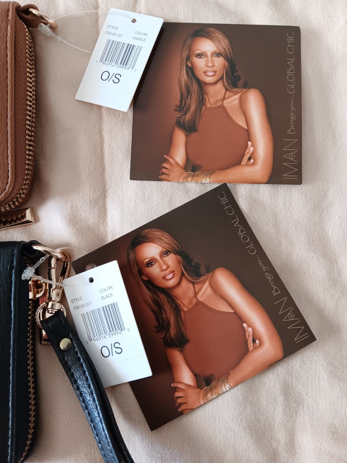 Wallet Wristlet Gift Set Lot of 2 Black Saddle Tan Gold Zipper Iman Global Chic Logo A great gift for any time of year! This large, slim wristlet is super functional thanks to the many interior pockets Color Choices: Black and Saddle Profile: Large, organizer wallet-style convertible wristlet with detachable wristlet strap Walls: Faux leather (manmade) walls Hardware: Polished goldtone metal hardware Closure: Zip-around Interior: 16 credit card slots, 2 slide pockets, 2 open compartments, 1 zipper coin pocket, and 1 ID window Measurements: approx. 8.25"L x 0.75"W x 4.5"H with 7" handle drop Warranty: Manufacturer's 1-year limited Shell: 85% PVC 15% polyurethane Care: Wipe clean #4498