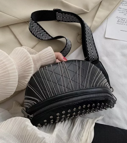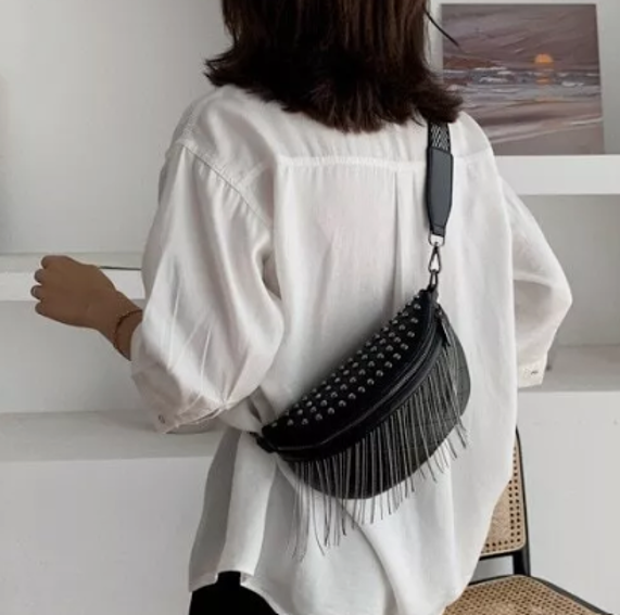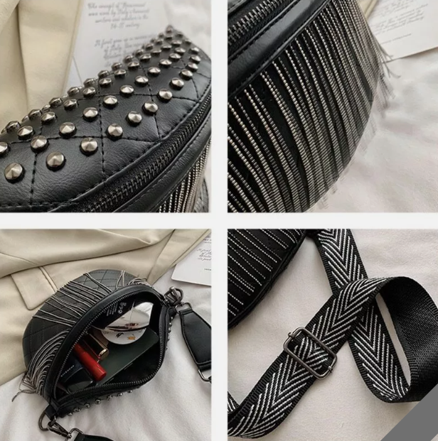 Sassy Crossbody Bag for Woman - Black and Silver with Fringe This stylish crossbody bag is perfect for any woman on the go. With a sleek black exterior, silver studs on top and silver tassels, it's both fashionable and functional. The bag is made from high-quality PU leather and features a black and silver nylon handle/strap. The bag is smaller, making it perfect for carrying just your essentials. The black lining complements the exterior and adds a touch of sophistication. This bag is ideal for any occasion and is sure to make you stand out. It's a must-have accessory for anyone who wants to look and feel her best. Height = 7 inches Width at top = 10 inches Adjustable strap = 20+ inches
