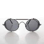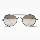 Get maximum eye protection from wind and sun with this steampunk sunglass featuring a bar brow and coveted side shield that fold. The all-metal frame is both ultra-modern and retro hip, a look guaranteed to get you admitted to the League of Extraordinary Gentlemen — no matter what your gender. polycarbonate lenses 100% UVA and UVB Protection Fit Information 50mm Eye Size 20mm Bridge 145mm Temple/Arm Width 5 3/8 Inches Height 1 3/4 Inches