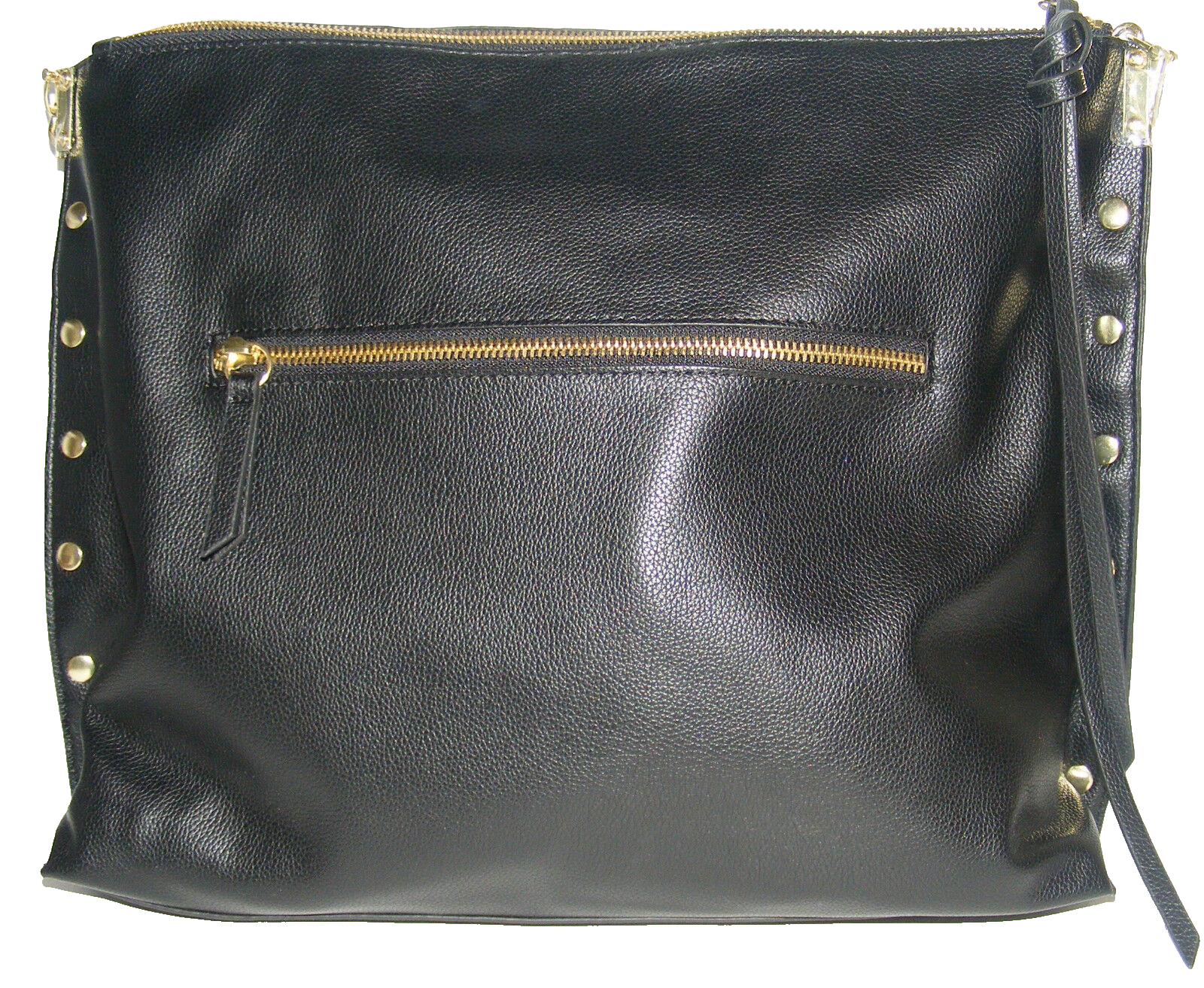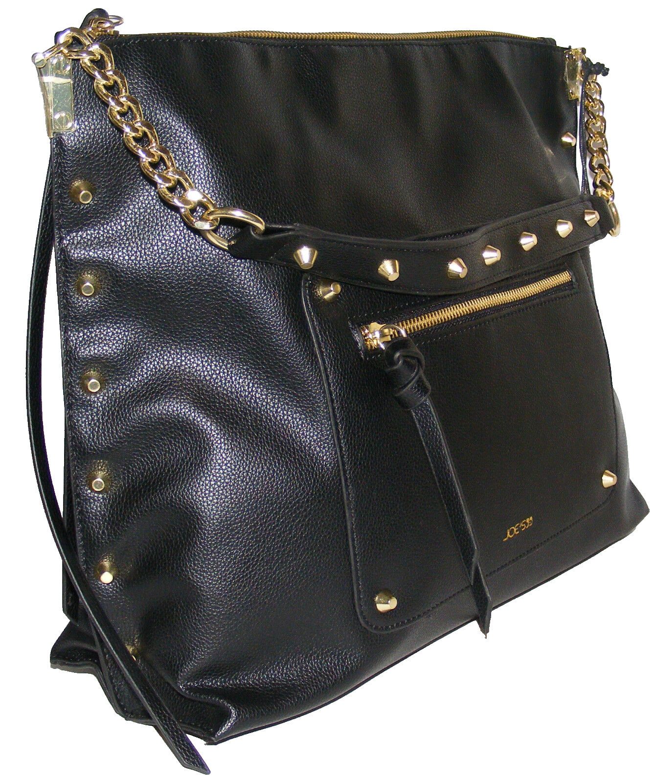 Joe's Jeans Emerson purse handbag faux leather style JJ1842. Material: 100% PU. Lining: 100% polyester. Color: black. Closure: metal zipper. Durable metal fittings. Inside 1 compartment with 2 slip pockets and 1 zipper compartment. 2 outside zip compartments for convenience. Metal studs detail golden color on the strap and trim. Strap construction: metal chain & faux leather stripe. Short shoulder strap 20½". All man made material. Joe's Jeans logo on the front. Everyday sporty look purse. Measurements: Length: 14" bottom, 15" top Height: 11" Width: 4 ¼" bottom, ½" top. Strap length: 20 ½".