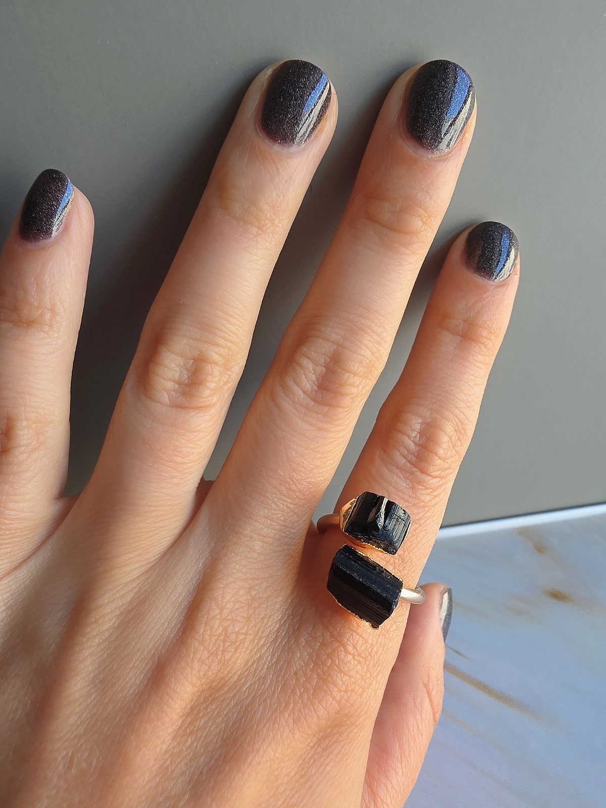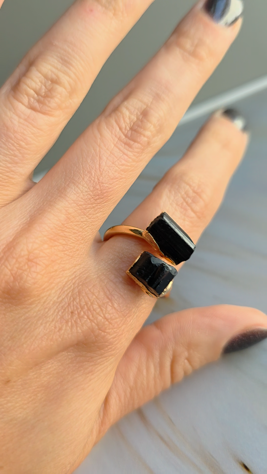 Channel powerful protective energy with this stunning Raw Black Tourmaline Ring, beautifully crafted with a bold, unpolished crystal set in an 18k gold plated adjustable band. This October birthstone ring is not only a striking statement piece but also a symbol of grounding and protection. The natural raw tourmaline crystal is known for its healing properties—perfect for warding off negative energy and enhancing spiritual balance. Designed with a copper base for durability and comfort, the open-ended design allows for easy adjustability, making it a great gift for yourself or a loved one. Ideal for witchy aesthetics, spiritual wearers, or anyone drawn to the raw beauty of nature-inspired jewelry. Whether worn alone or stacked, this ring brings a unique edge to your collection. 💫 Wear it on your left hand (middle or index finger) for a daily protection, give it a gentle wipe to keep it shiny 🧼, and recharge its energy in the sun ☀️, under the moon 🌕, or on some soil or crystals 🌿. Comes with a gift box 🎁 — perfect for yourself or someone special!