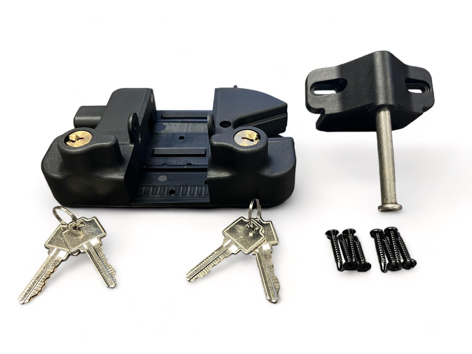 TWO-SIDED FENCE GATE LATCH: Secure your fence or railing gate with the Travers gate latch. It's compatible with vinyl, wood, and metal gates, and allows easy access from both sides of the gate. Works with left or right swinging gates. HEAVY DUTY CONSTRUCTION: Manufactured from high quality, durable UV-resistant nylon polymer and stainless steel, the Keystone latch will not rust or corrode over time. LOCKABLE GRAVITY LATCH: The Keystone Latch utilizes self-latching technology to prevent jamming and sticking. It uses a 6-pin key cylinder and locks/unlocks from both sides. EASY TO INSTALL: The gate latch kit includes instructions and all necessary fasteners for easy installation. It does not require any holes to be drilled through the posts. It is designed to fit square gate posts up to 2 inches.