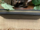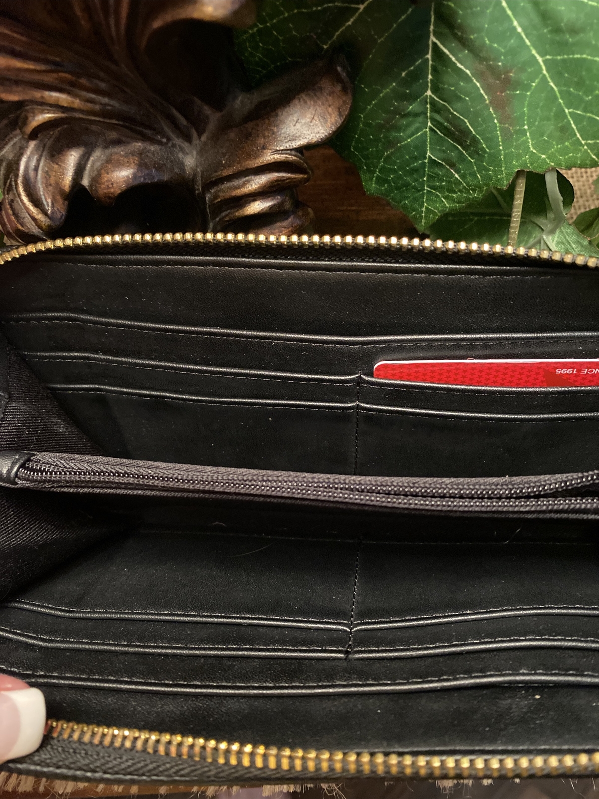 This lightweight black vegan leather wallet is 8 inches long by 4 inches wide and the depth is 1 inch when closed. It opens for inside access to approx. 5 and 1/2 inches The vegan leather is pebble textured for a real leather non shiny look. The zipper is gold It is sturdy and ready to fill with 8 credit cards with two long pockets for other things as well as long central zippered pocket for change Caring seller Original owner